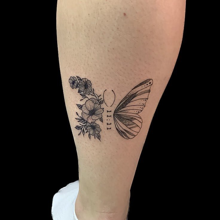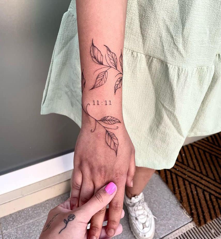 This design mixes flowers and butterfly wings around the 11:11, creating a composition that’s romantic and slightly mysterious. The black-and-gray palette keeps it chic, like a tiny nature scene that doubles as an intention anchor.