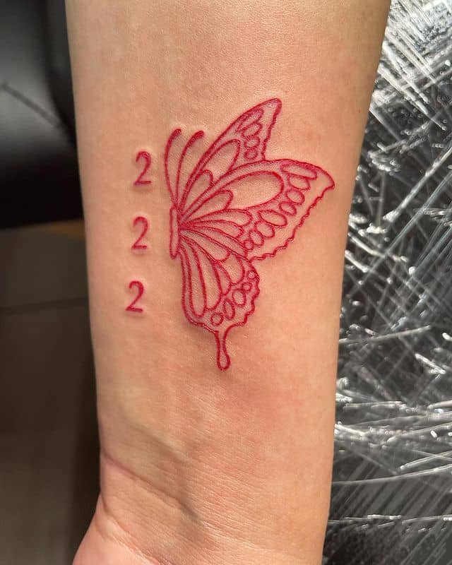 A red 222 with a butterfly feels like a tiny rebirth. The butterfly brings transformation and new beginnings, and when it lands beside 222, it reads like "you’re growing into alignment." Bold color, gentle meaning — a really beautiful combo.