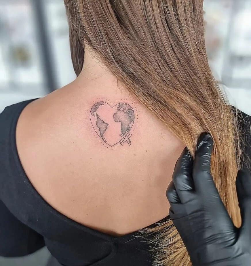 Simple tattoos can say so much. This outline of a plane with a tiny heart tucked in? It’s basically a love letter to travel — unflashy but full of meaning.