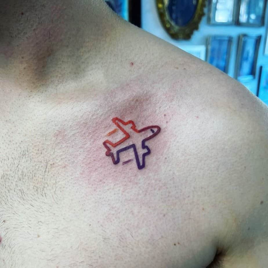 A tiny gradient plane with thicker lines proves simple tattoos can still shine. It’s small, colorful, and somehow confident — a little statement that travels well.
