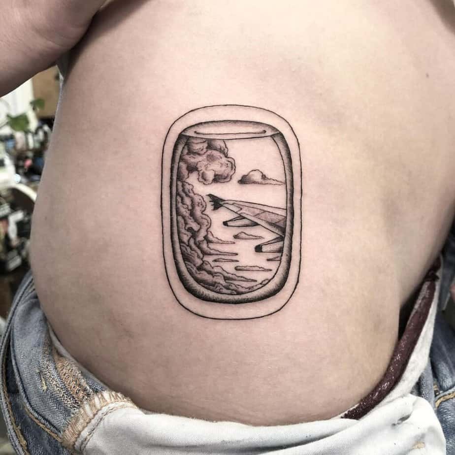 This take on airplane windows skips the outside view and leans into bold blackwork. It’s a neat, graphic option if you love striking shapes and a slightly mysterious vibe.
