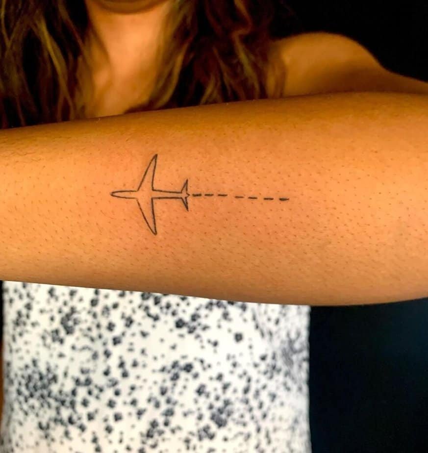 A minimal fine-line plane shows you don’t need loud details to make a statement. It’s clean, elegant, and says “I’m always planning the next trip” in the calmest way possible.