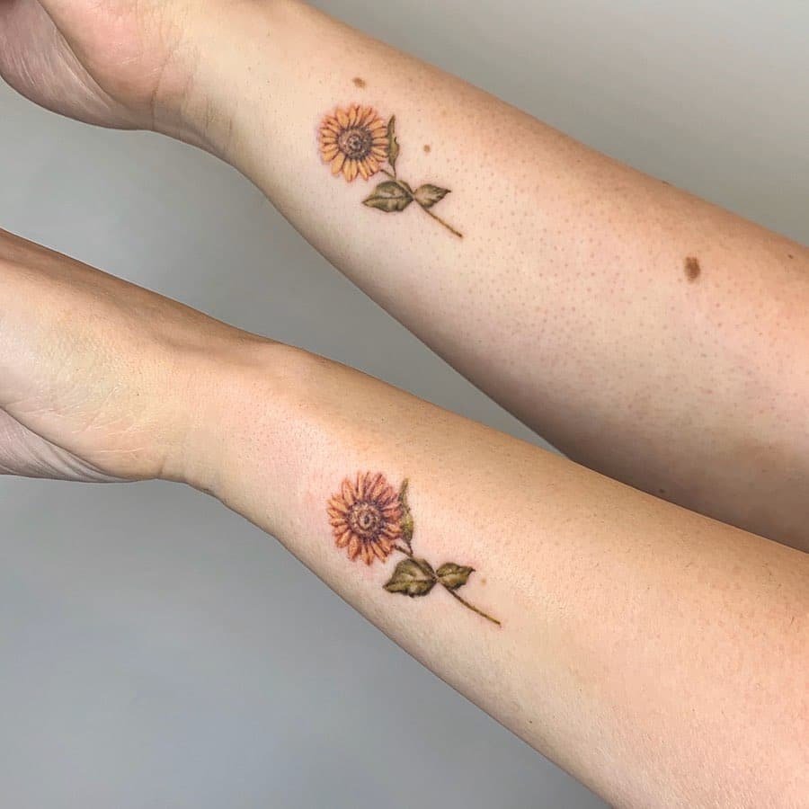 Sunflowers are joyful and warm — symbolic of hope and happiness. Matching sunflower tattoos feel optimistic and sweet, like a little reminder to keep looking toward the light together.