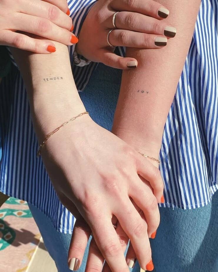 When you can’t decide where to put a tattoo, tiny finger ink is such a vibe. It’s small, it peeks out in just the right moments, and it’ll make you both grin every time you catch it. Think words like “always” or little symbols that mean something only you two laugh about.