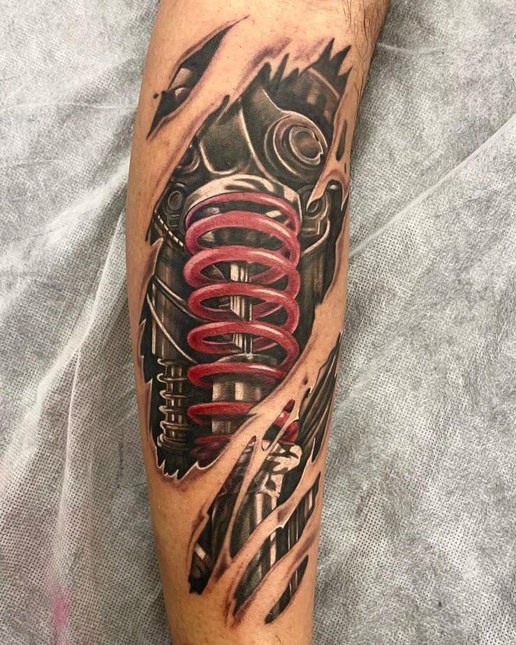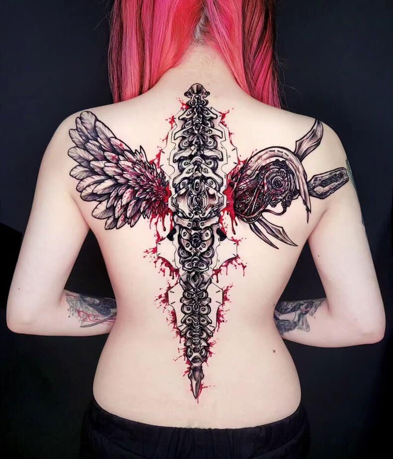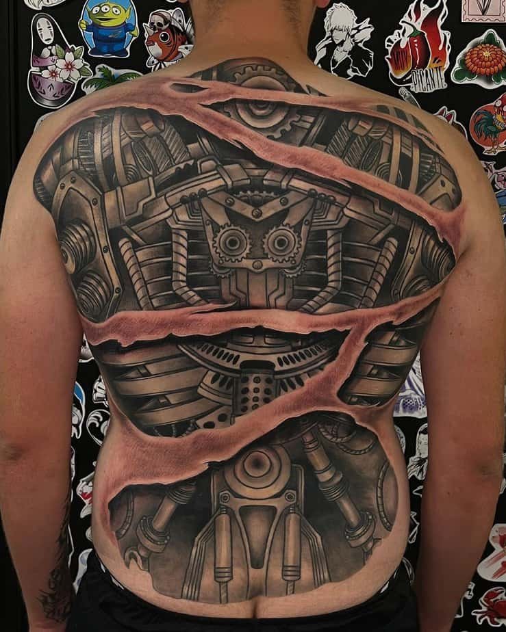 The back is perfect when you want scale. You can go feminine with wing-like mechanical spines (there’s something haunting about red highlights that look like mechanical blood), or you can do a massive, almost architectural machine that fills the space without tiny distracting details. Big back pieces often use broad dark shading to set everything off and then let realistic skin-rips and tears be the finishing touch. The effect is dramatic and intentional — like a secret you only share when you want to.