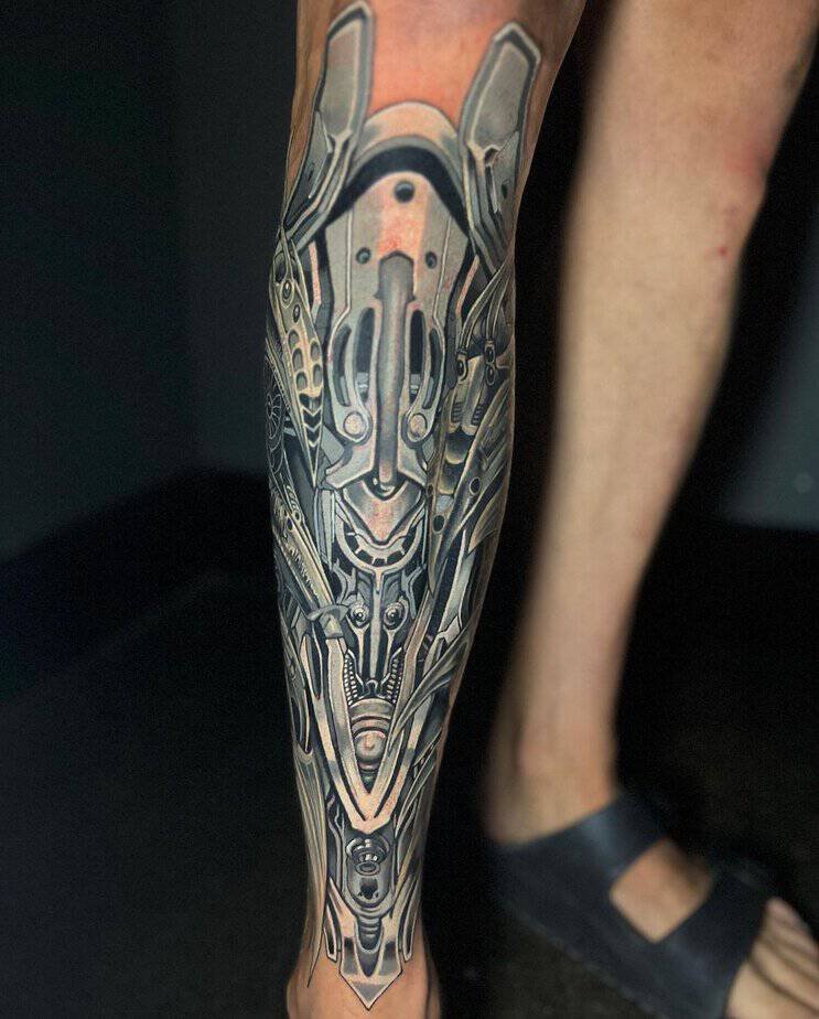 Leg placements bring a different energy — they can be darker and more dramatic without crowding, and highlights and light shading add depth so the whole piece reads clearly from a distance. Some of these lean into a blue-gray metallic vibe so the tattoo reads like actual metal plating, not just ink. Expect multiple sessions; big leg pieces with deep backgrounds take time, but they age beautifully when handled with that layered approach.