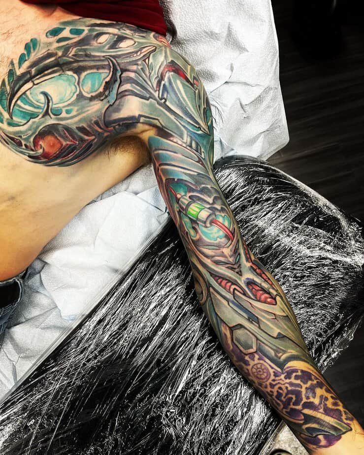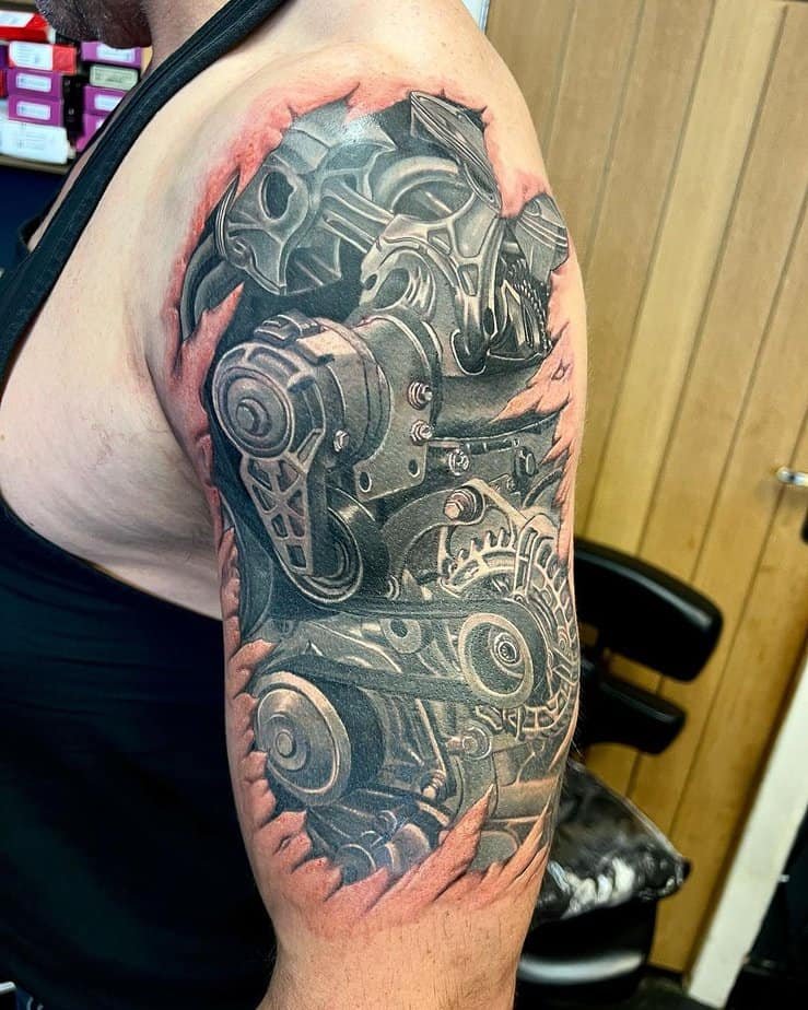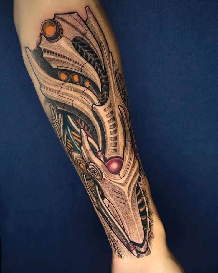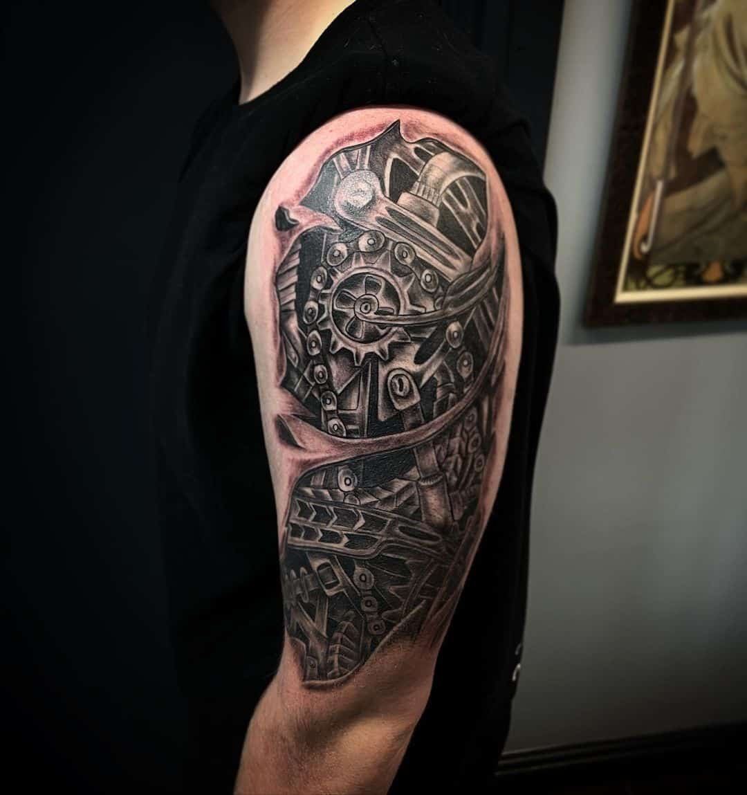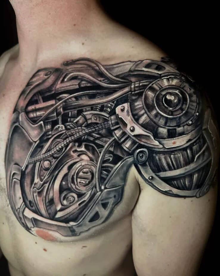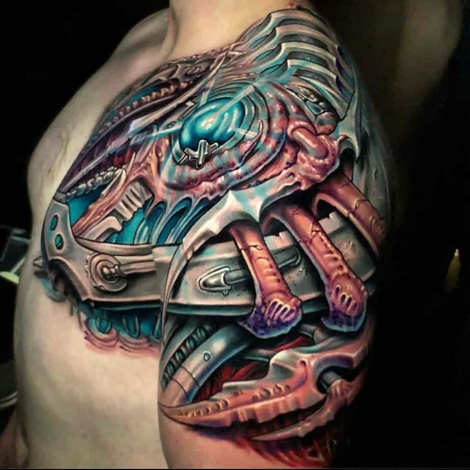 If you don’t want something just on the forearm or bicep, the shoulder is a great place to let a biomech design breathe and flow. Some shoulder pieces cascade down the arm or even onto the chest — they can be dense with machines so your eye gets happily lost in the composition. There are designs here that look downright alien, almost like spaceship innards with bold color palettes where shading becomes everything. Color can make a shoulder tattoo pop in a way black-and-gray can’t, but there are also giant monochrome machines that keep things bold and simple.