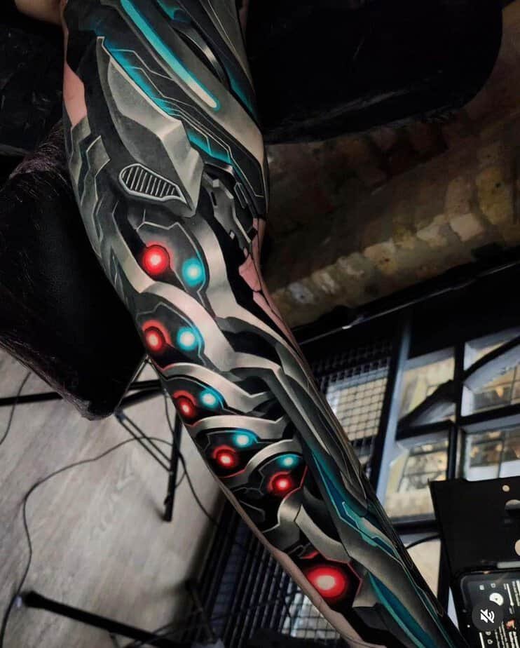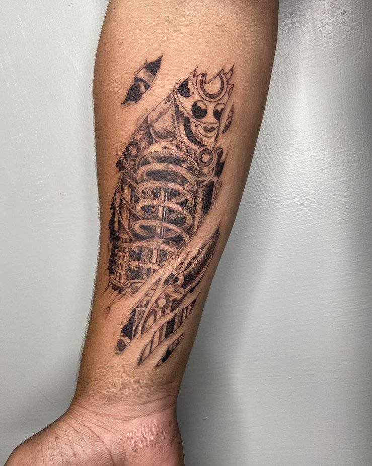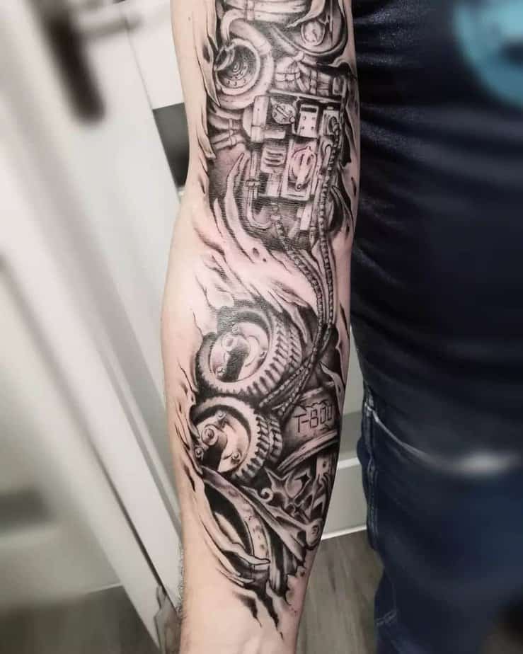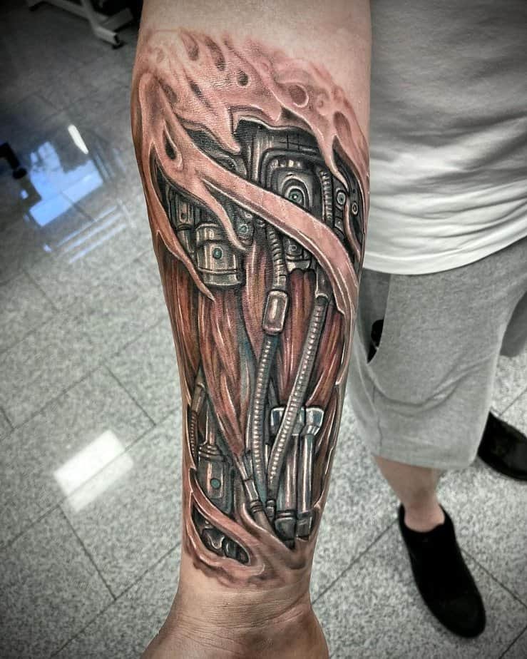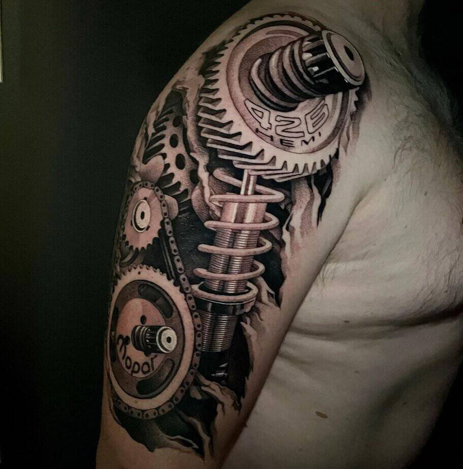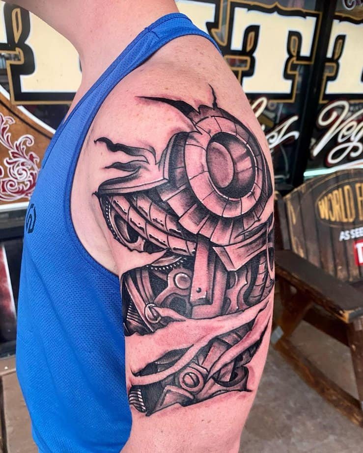 If you don’t want something just on the forearm or bicep, the shoulder is a great place to let a biomech design breathe and flow. Some shoulder pieces cascade down the arm or even onto the chest — they can be dense with machines so your eye gets happily lost in the composition. There are designs here that look downright alien, almost like spaceship innards with bold color palettes where shading becomes everything. Color can make a shoulder tattoo pop in a way black-and-gray can’t, but there are also giant monochrome machines that keep things bold and simple.