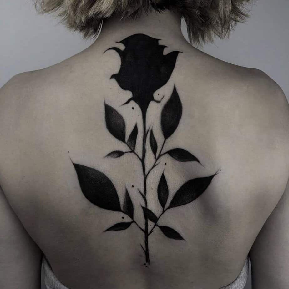 A large, jet-black rose across the back is for people who love statement pieces. Thick petals, sharp leaves — this one grabs attention and doesn’t let go. It’s dramatic in the best way.