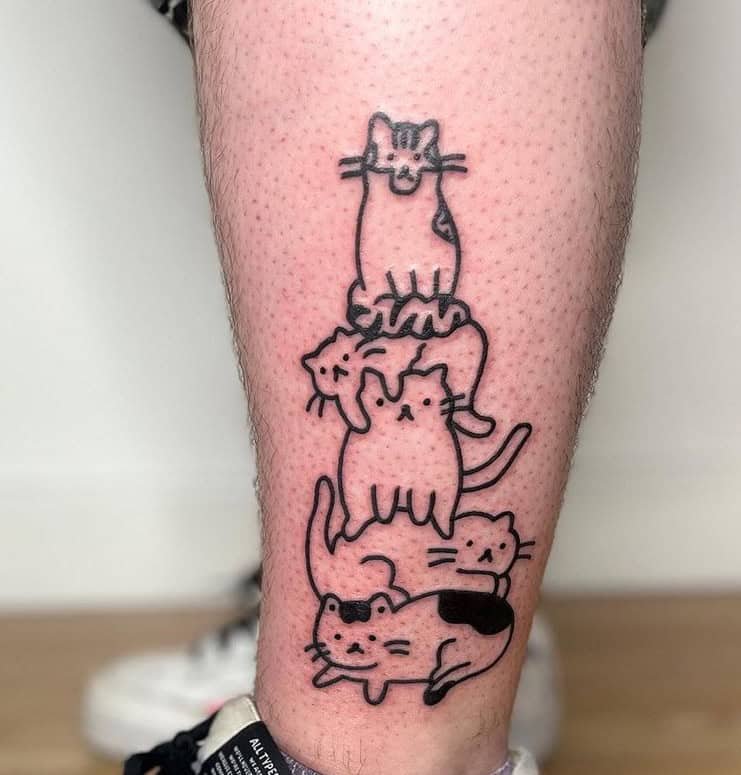 This leg piece is joyful and playful: five cats stacked one on top of another, making a literal cat tower. It’s bold, creative, and totally shows off that fun-loving side of being a cat person.