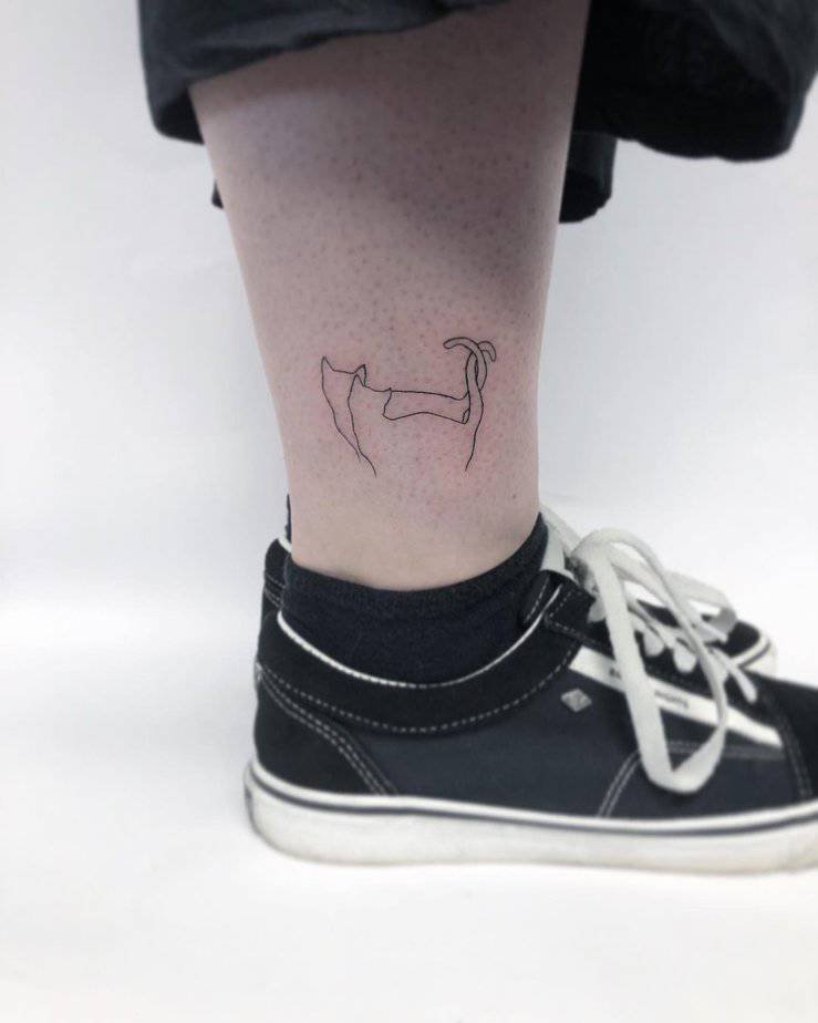 A sweet little ankle tattoo showing two cats walking and snuggling, their tails twining together. It reads like a delicate symbol of partnership — romantic, but also pure and tender.