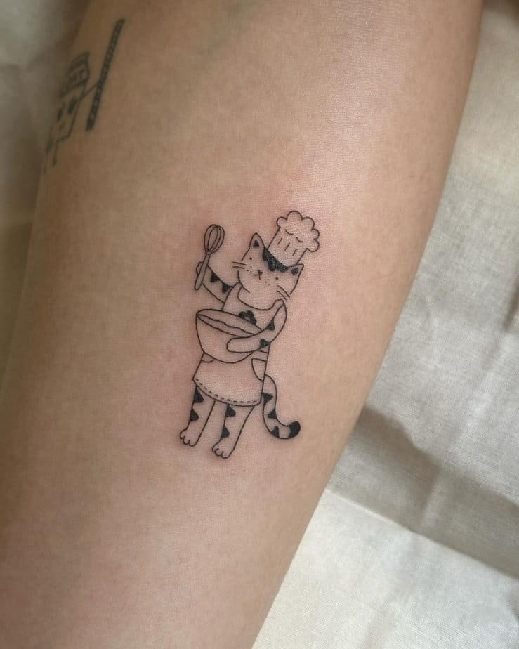 This playful design imagines a cat as a little chef — whisk in paw, bowl in the other, apron tied on and a chef’s hat perched up top. It’s quirky, fun, and perfect for anyone who loves cooking or just a silly, characterful tattoo.