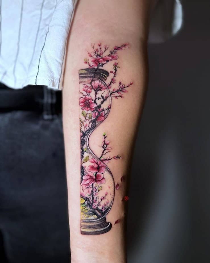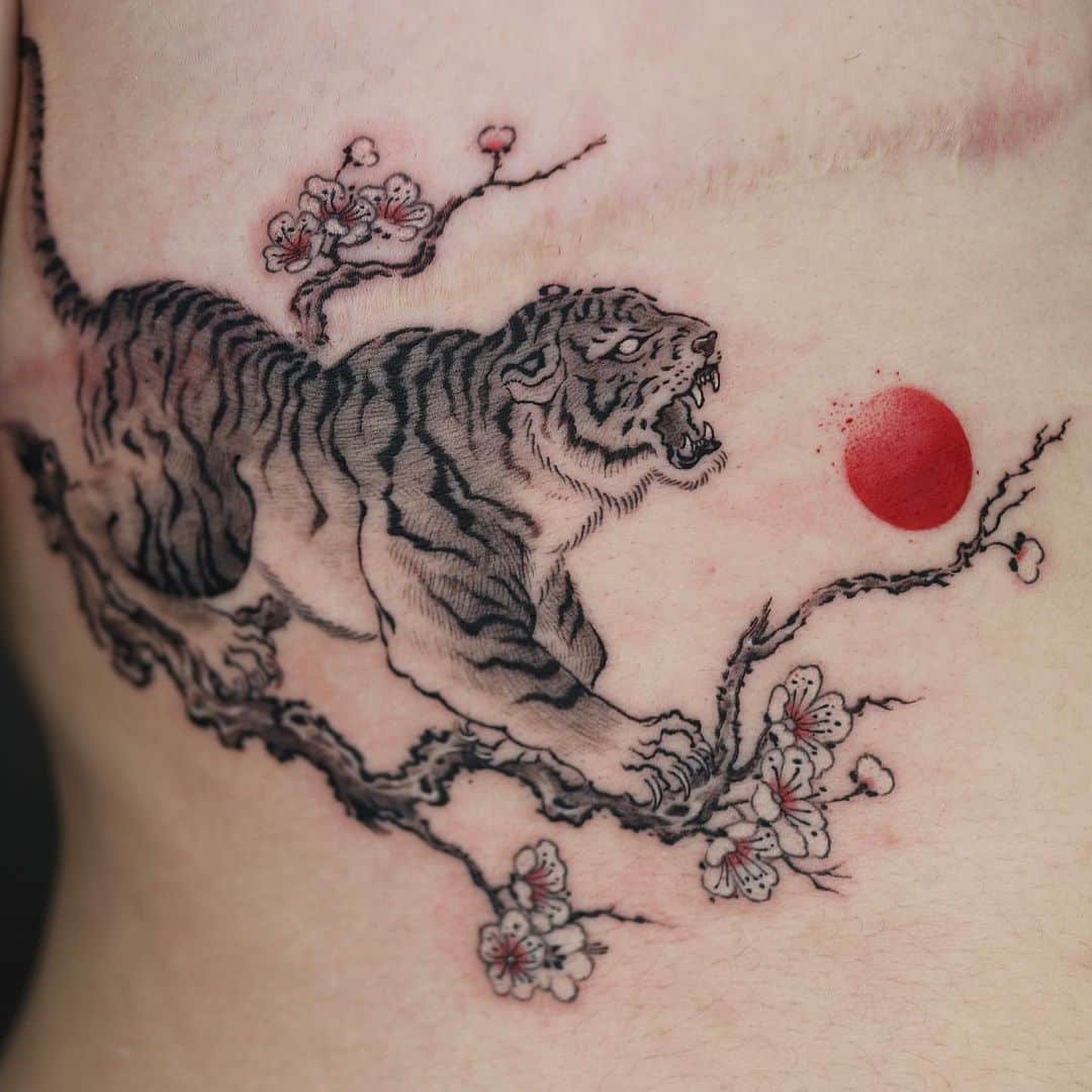 Cherry blossom tattoos can sneak into so many unexpected places. Picture a fan with black and red tones where the flowers are part of the pattern, or an infinity symbol made of tiny sakura for a subtle forever-thing. Minimalists might love a little window of cherry blossoms in black and gray. If you want symbolism, an hourglass with blooms spilling out of it says time and growth in one neat image. And for drama, a Japanese-style tiger with a red sun and blossoms underneath is both fierce and poetic.