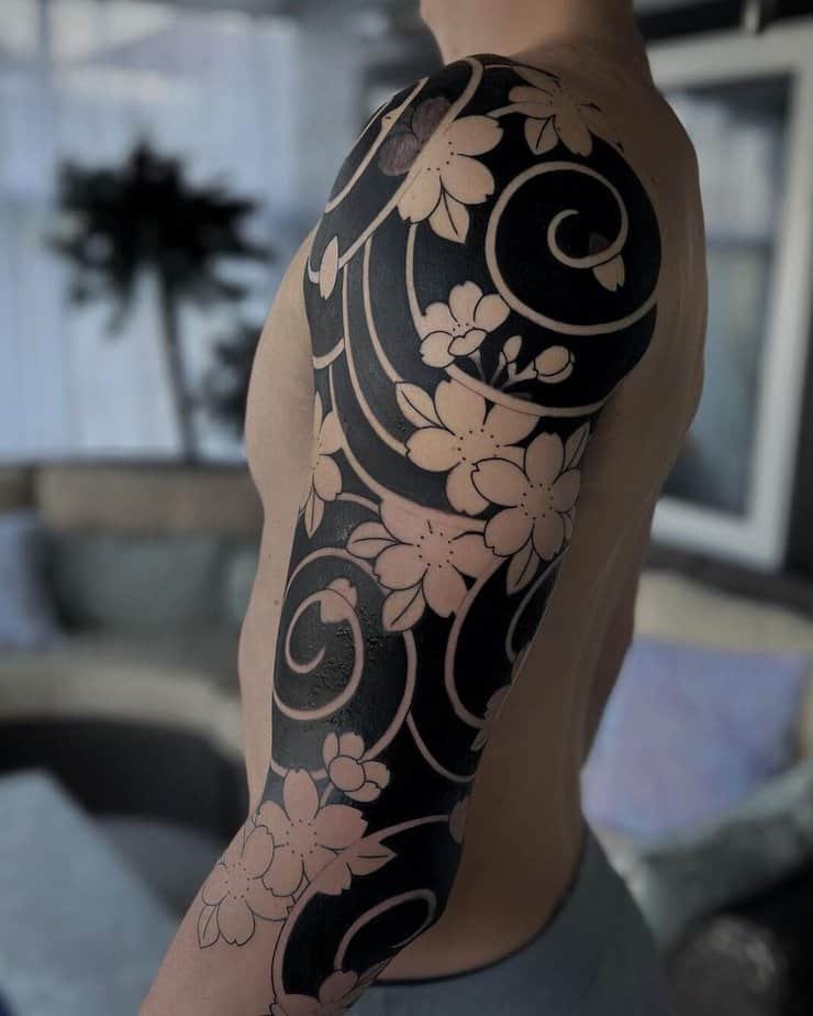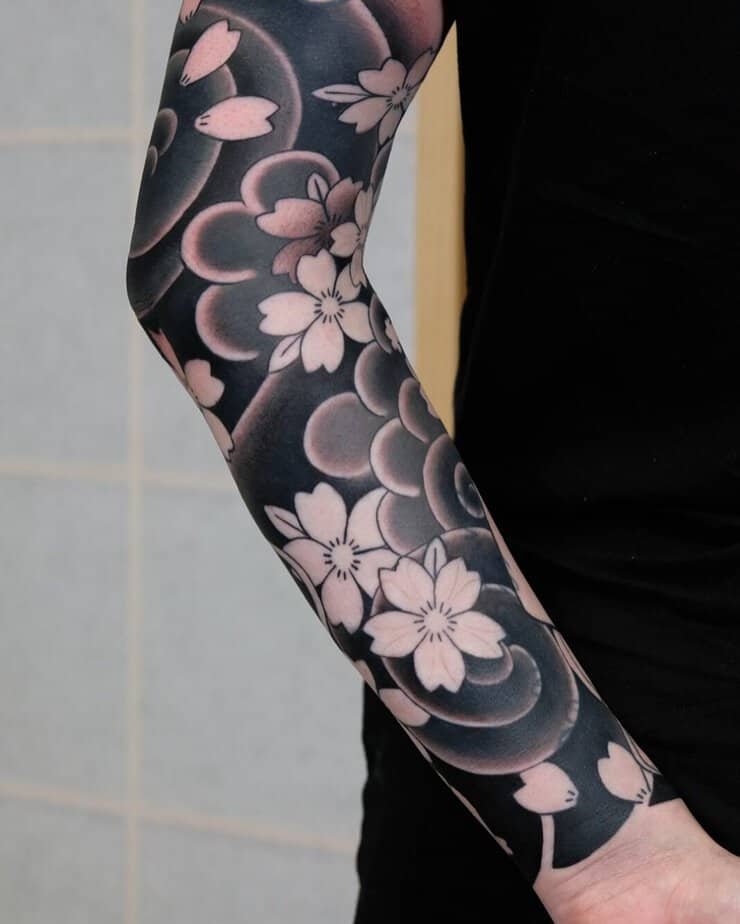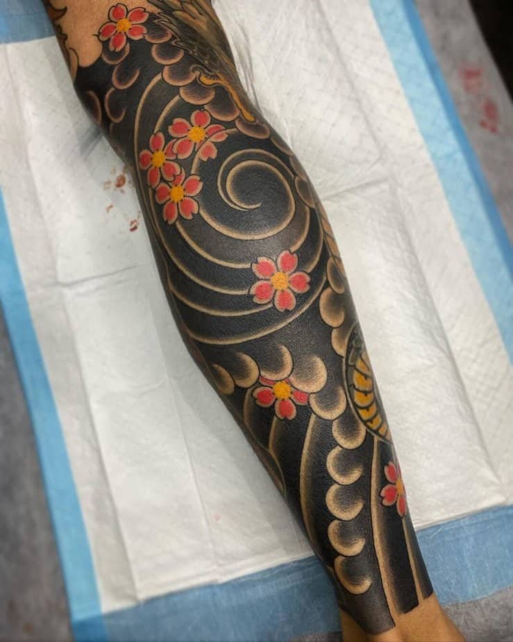 If you’re brave and want to commit, a sleeve is a whole mood. Some of these sleeves lean into blackout work so the blossoms pop even harder thanks to the negative space. Japanese-traditional vibes are especially gorgeous here — think black, gray, and red moving with the arm. You don’t have to go full-sleeve either; half-sleeves hit just right, with saturated blacks that let the flowers be the star. And get this: sleeves don’t have to live only on arms. There are leg sleeves where tiny splashes of color make everything feel alive and authentic.
