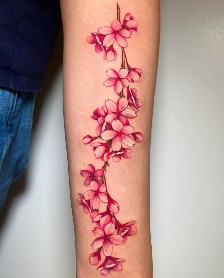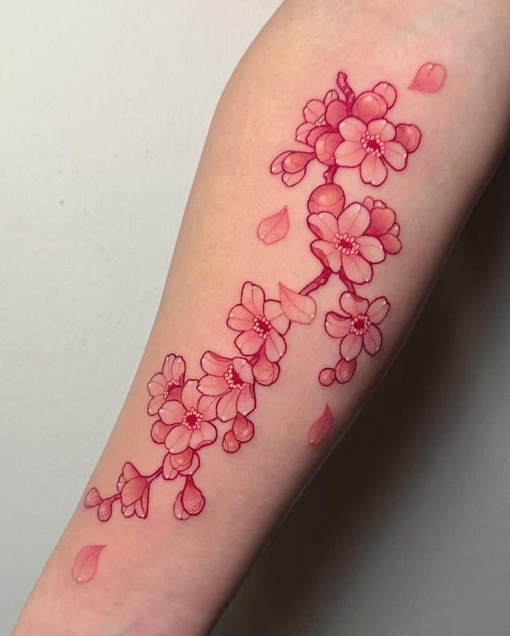 There’s something so nurturing about pink blossoms — they feel true to the flower and soft on skin. Shoulder pieces can look almost photo-real, delicate outlines in pink against a dark branch. Some follow the collarbone down toward the chest and still feel clean and saturated. If you want pure color, skip the black entirely and let shades of red and pink do the shading; it can look more natural that way. Then there are playful, less realistic styles where even the branch is pink and petals fall for movement. Rib tattoos are a whole other vibe — they follow the body in a way that feels intimate. And forearm pieces? When the branches are done with fine lines and the blossoms with layered pinks, the result is quietly stunning. A tiny touch of green leaf can warm the whole thing up.