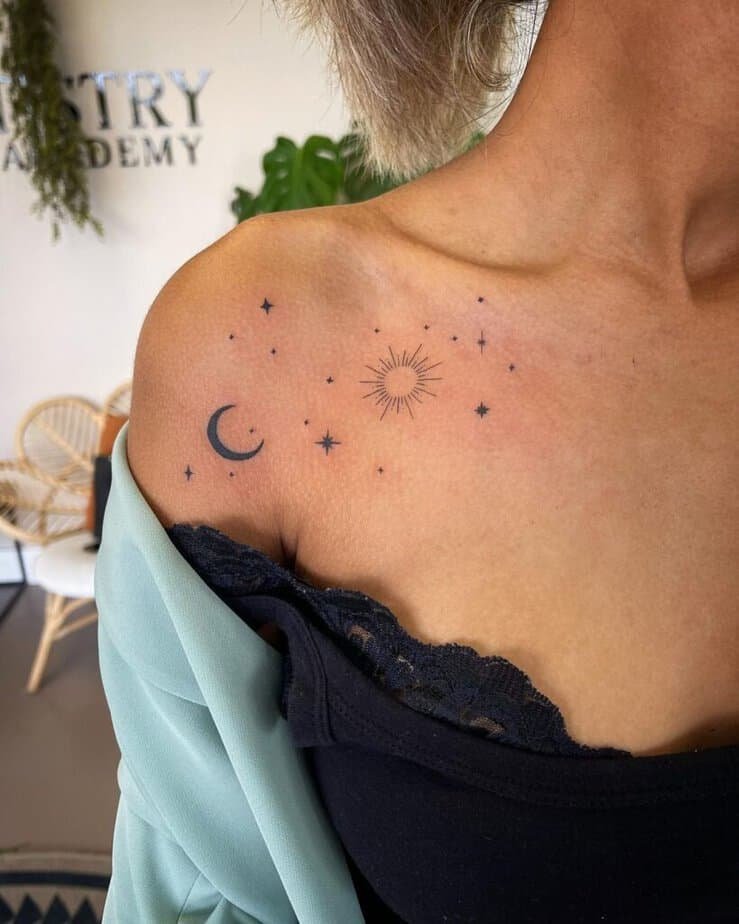 Moon and stars—tiny cosmos on your collarbone