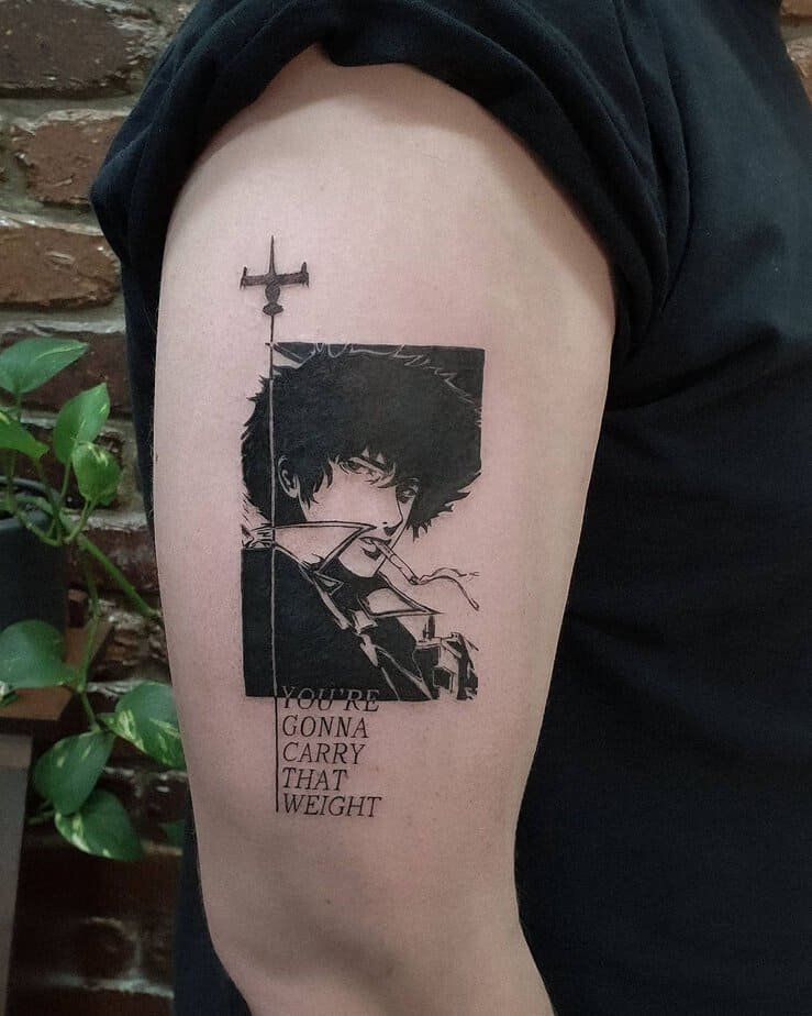 This monochrome upper-arm piece is all mood: Spike staring off, cigarette in hand, and the Swordfish II drifting above. The line 'You’re gonna carry that weight' makes it more than a cool portrait — it’s a little philosophy on your skin about loss, baggage, and the weird, stubborn way we move forward anyway.