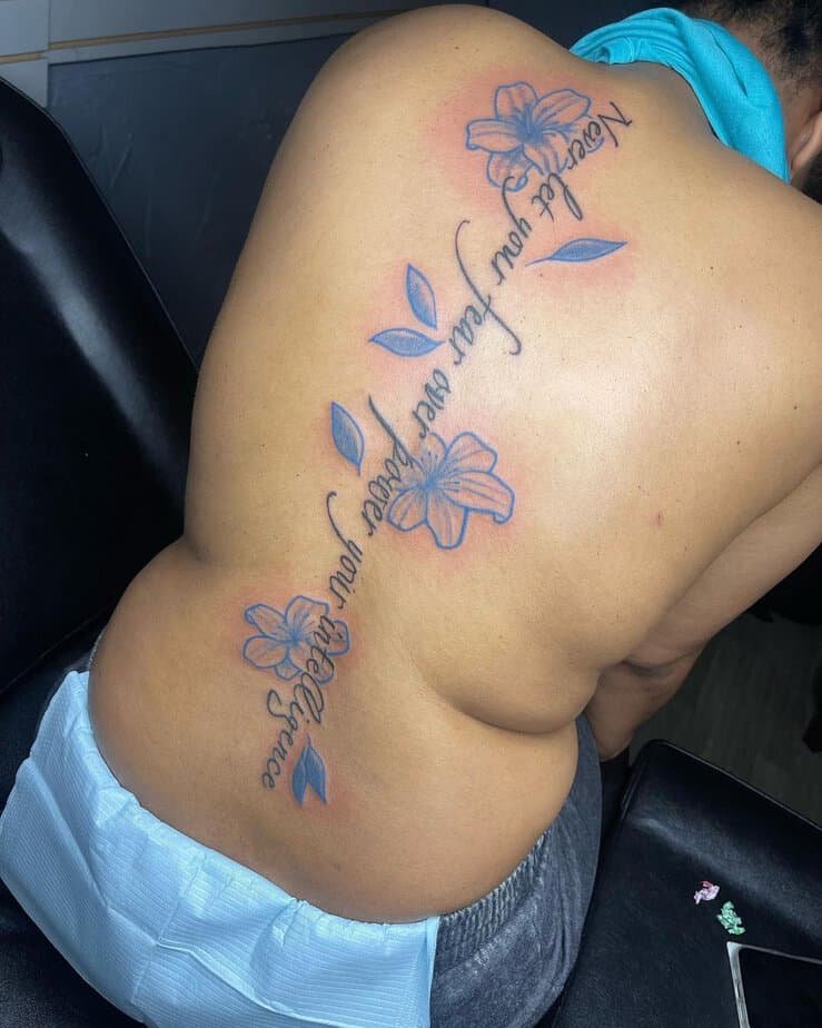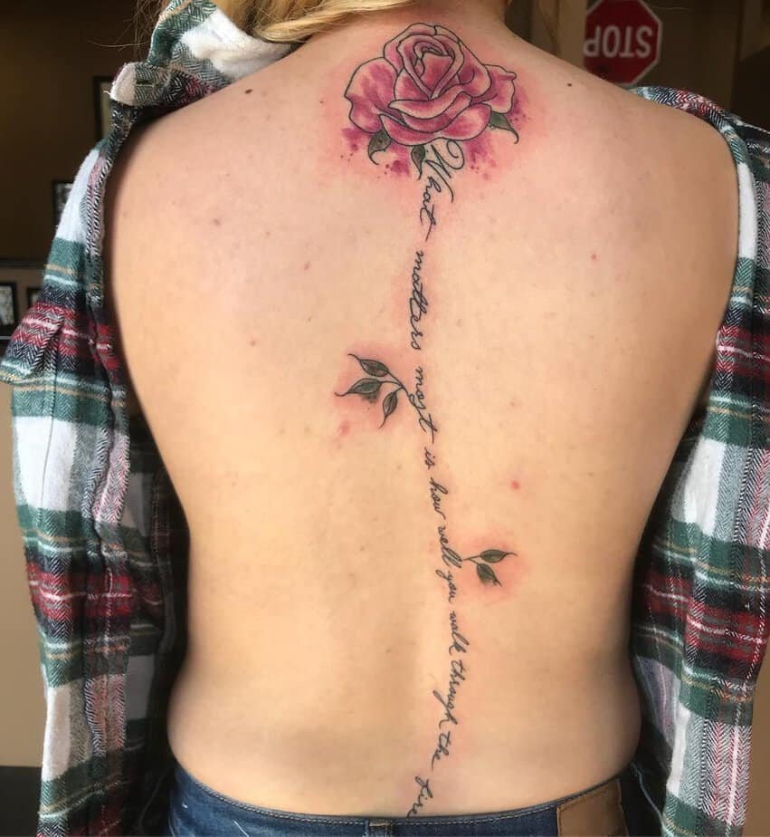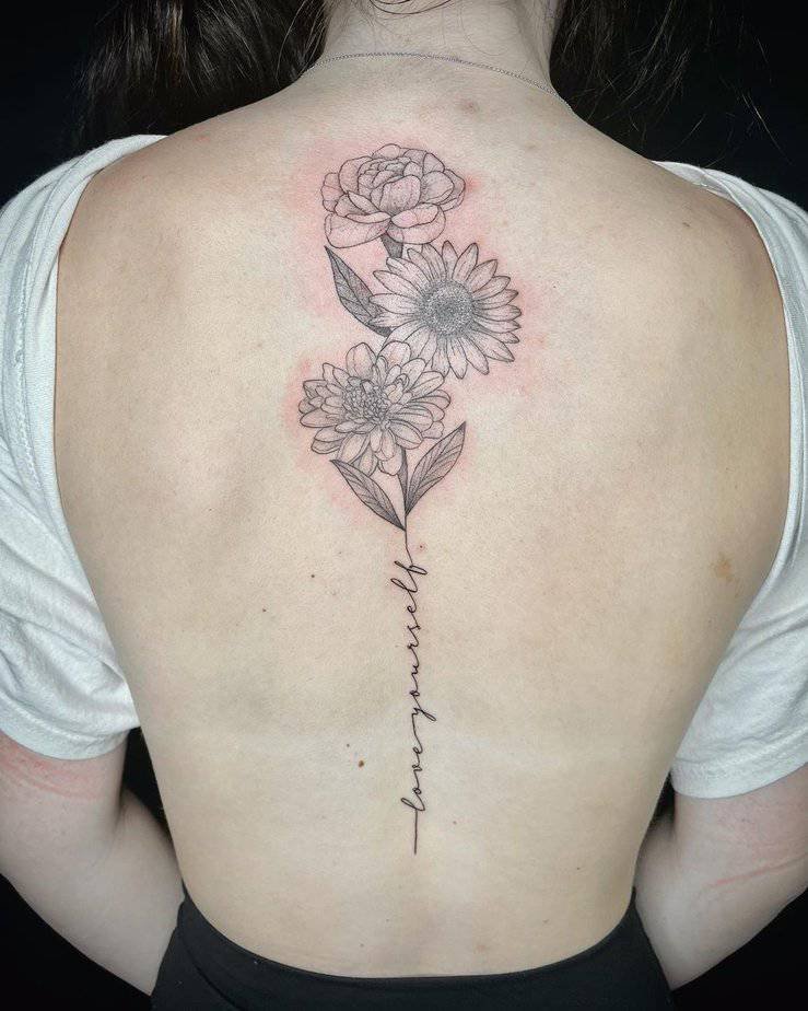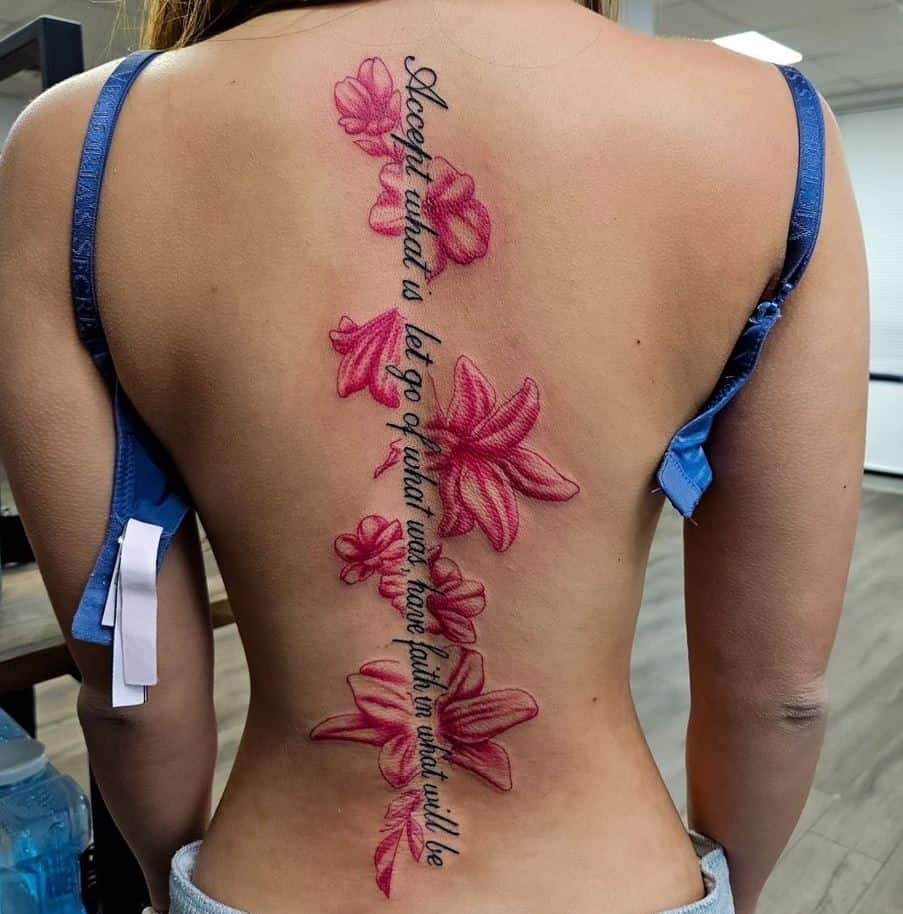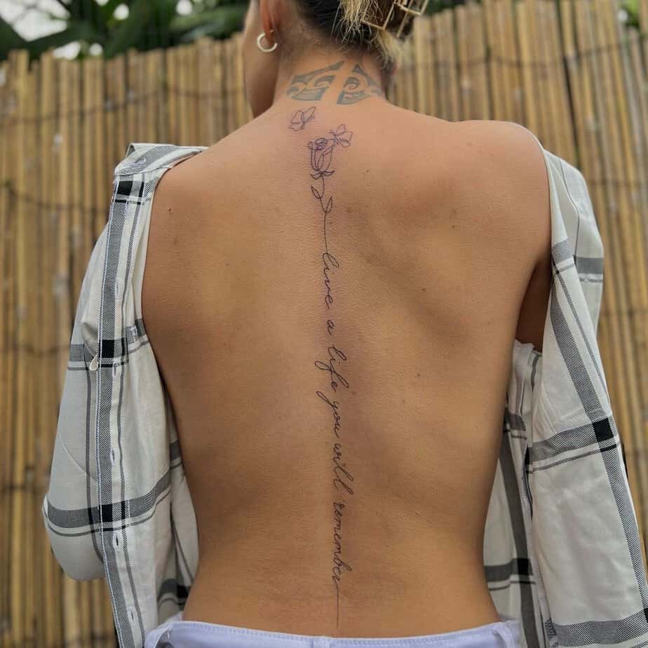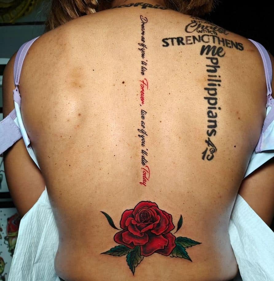 Spine tattoos don’t need to be only words. Add a few floral accents around the letters and suddenly the whole thing feels personal and cohesive. Flowers soften the script and give it a botanical, wearable-art look.