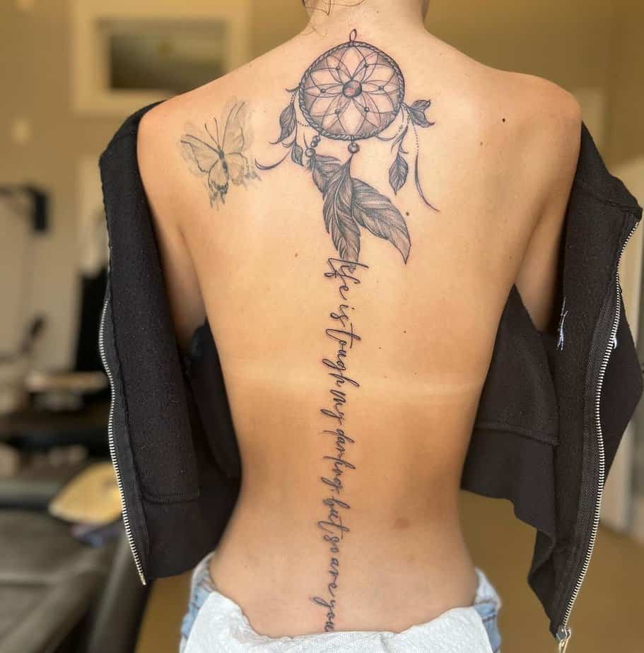 If dream catchers speak to you, tuck one at the top of your spine tattoo. It brings symbolism and a beautiful visual anchor for the rest of the quote.