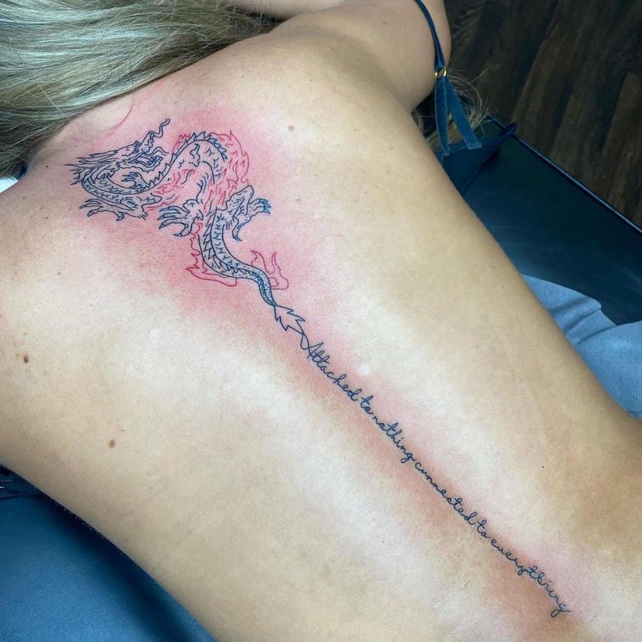 A lotus at the top adds a really feminine touch. It’s simple and sweet, giving the whole piece a gentle, meditative energy. If you want your spine tattoo to feel tender and graceful, this is a lovely way to start it.