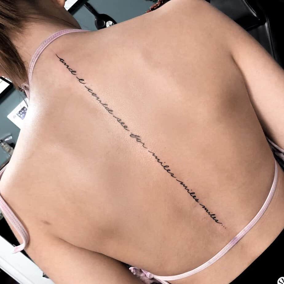 If you want zero fuss, go minimal and centered. Pick a quote that sits with you, have the artist line the stencil straight down your spine, and let the script do the talking. If you like lyrical vibes, something like "And I could see for miles, miles, miles…" reads dreamy and timeless.