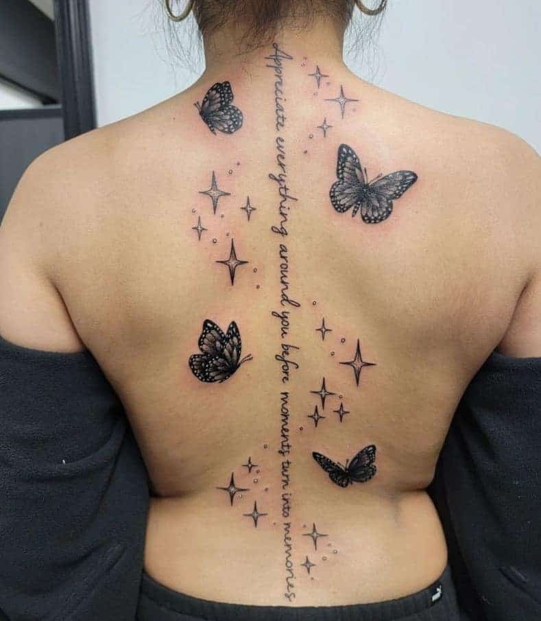 Small butterflies sprinkled along the spine are simple but charming. They add a playful, dainty vibe that pairs so well with fine-line cursive.