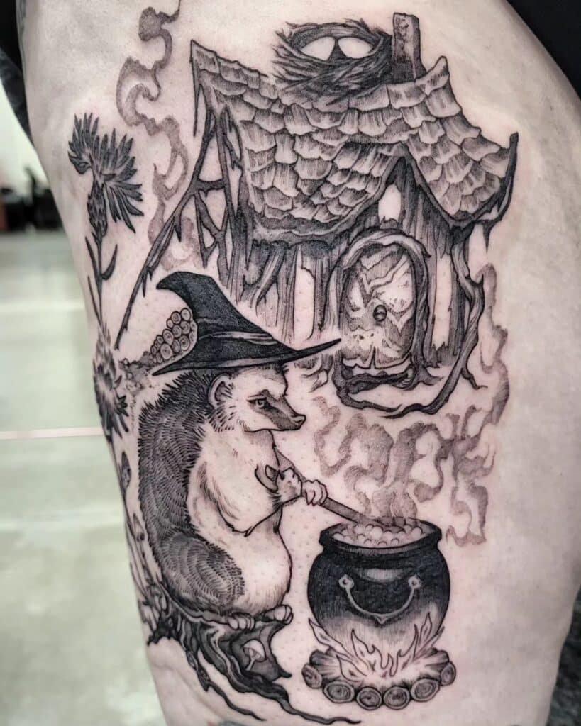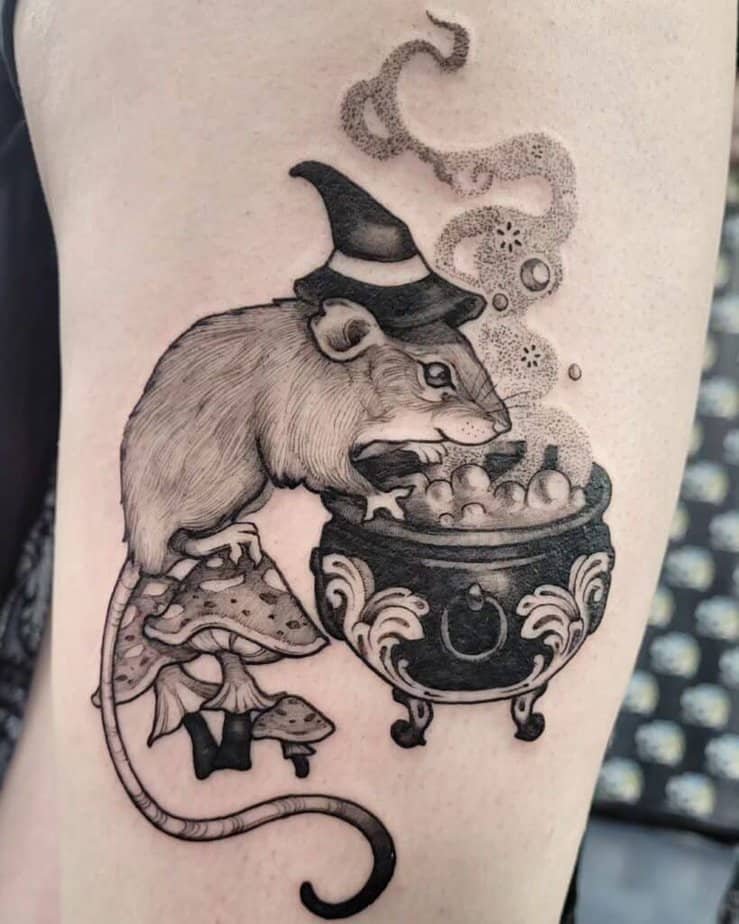 Witches have always been shorthand for women who stepped outside the line. So yes, broomsticks and pointy hats are iconic, but the witchy category goes deeper: moons, stars, crystals, botanicals, cauldrons, familiars. Some designs are majestic — moons and nature woven with occult symbols — while others are charmingly blunt: a witch with a black cat and flowers that says exactly who she is. And if you want a softer touch, there are adorable witchy animals too, like a mouse tending a cauldron. It proves dark feminine doesn’t have to be terrifying to be truthful.