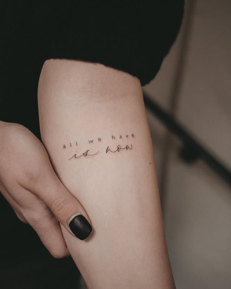 Life moves fast and honestly, we forget to breathe sometimes. This delicate little tattoo that says ‘all we have is now’ is the sort of thing you glance at and instantly remember to be present. It’s not preachy — more like a soft nudge to savor the small stuff, let go of what you can’t control, and actually live the day you’ve got. Why not make the most of it?