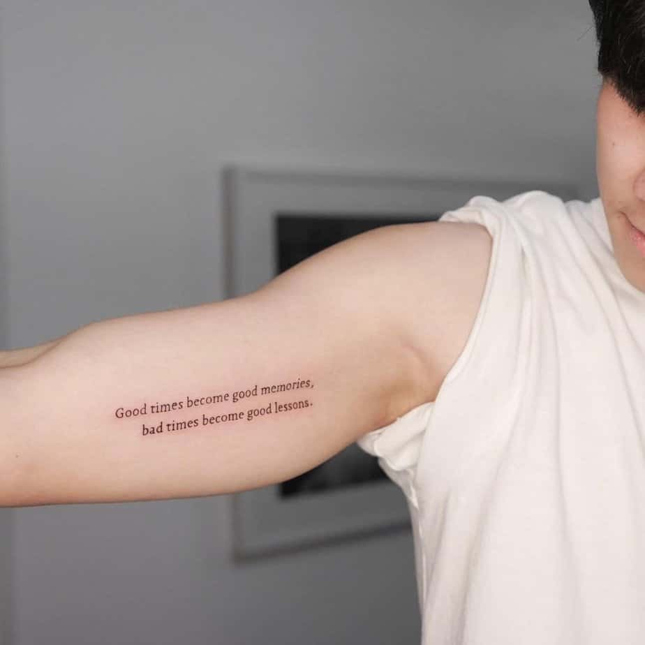 The good becomes memory and the bad becomes lesson — that’s the vibe here. This bicep tattoo feels like a life motto: embrace joy, learn from pain, and let both shape who you are. It’s honest and quietly brave.