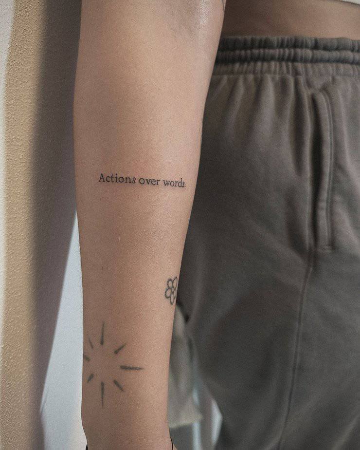 ‘Actions over words’ is simple and uncompromising. In a world full of talk, this tiny phrase commits you to follow-through and authenticity. It’s the kind of ink that reminds you to live with intention, not just good intentions.
