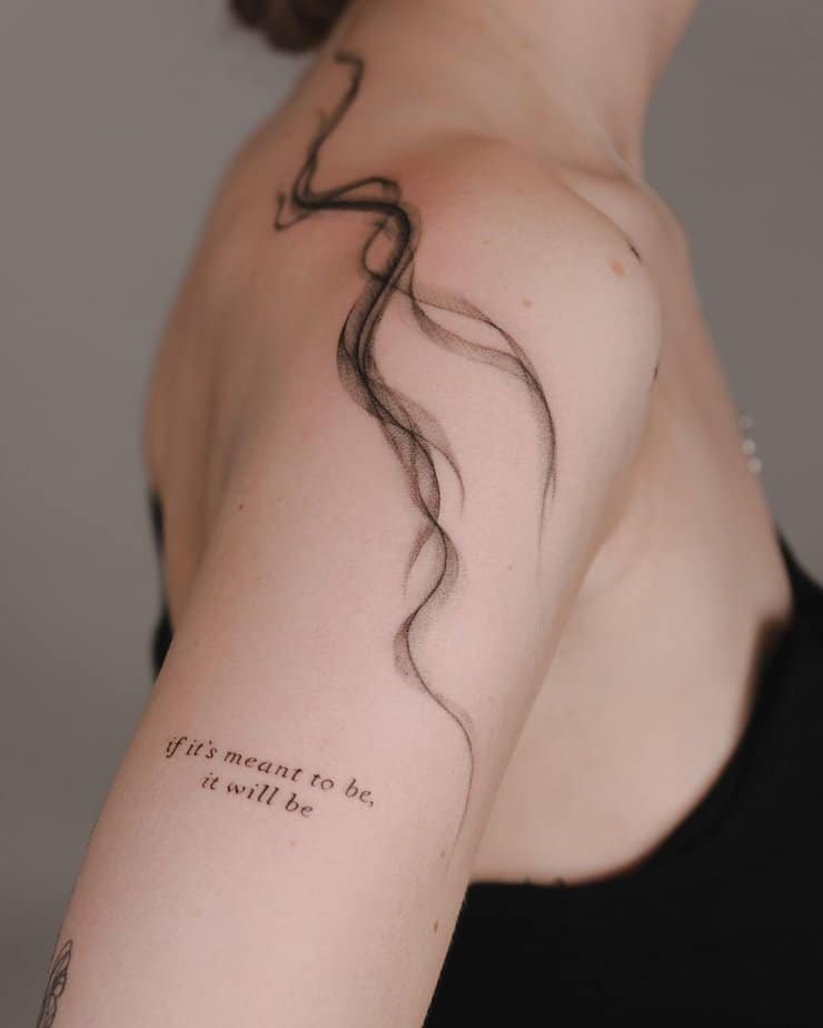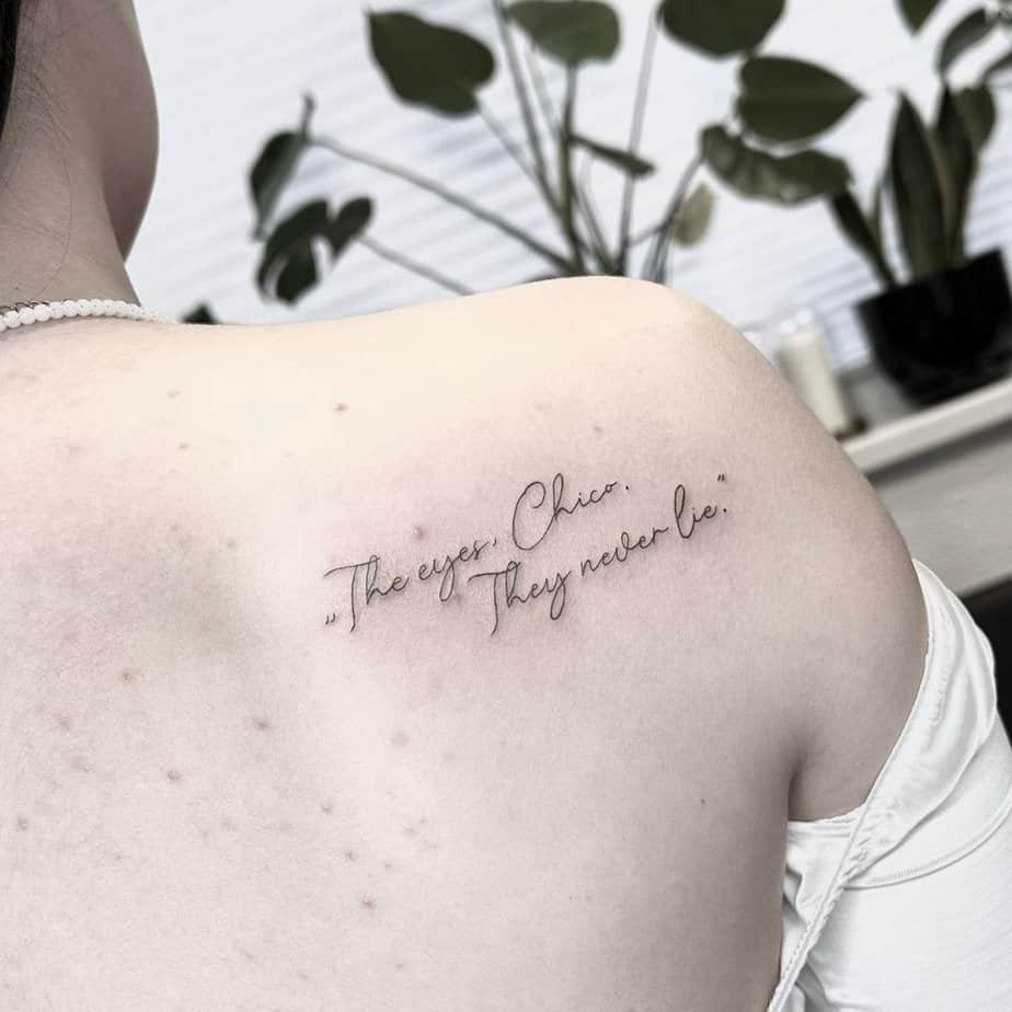 This line borrowed from a movie has this mysterious, romantic pull: the idea that eyes tell truths words won’t. It’s stylish and a little cryptic — perfect on a shoulder where it invites questions and quiet conversations.