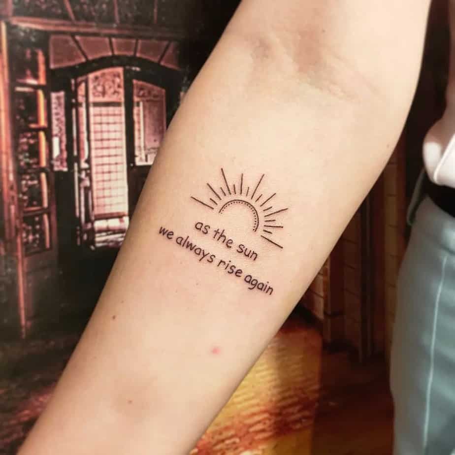 ‘As the sun we always rise again’ is a sunny little promise that every setback has a sunrise waiting. The small sun motif makes it hopeful without being cheesy — a bright reminder that renewal is possible, even after hard days.