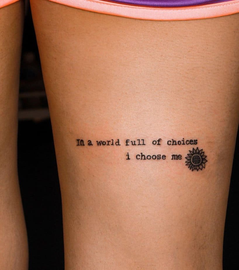 ‘I choose me’ — such a tiny declaration but also a full-on act of self-love. When the tattoo reads ‘in a world full of choices, I choose me,’ it’s like carrying a daily permission slip to put yourself first. The sunflower vibe that usually comes with this design just makes it warmer and somehow sunnier, a reminder that choosing yourself can actually be joyful, not selfish.