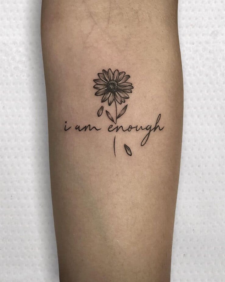 If self-doubt creeps in (and it will), a tiny ‘I am enough’ tattoo is like whispering back to your anxious brain. Paired with a little flower, it’s not loud or dramatic — it’s steady and soft, a daily reminder that you are whole as you are. Honestly, that kind of gentle encouragement never gets old.