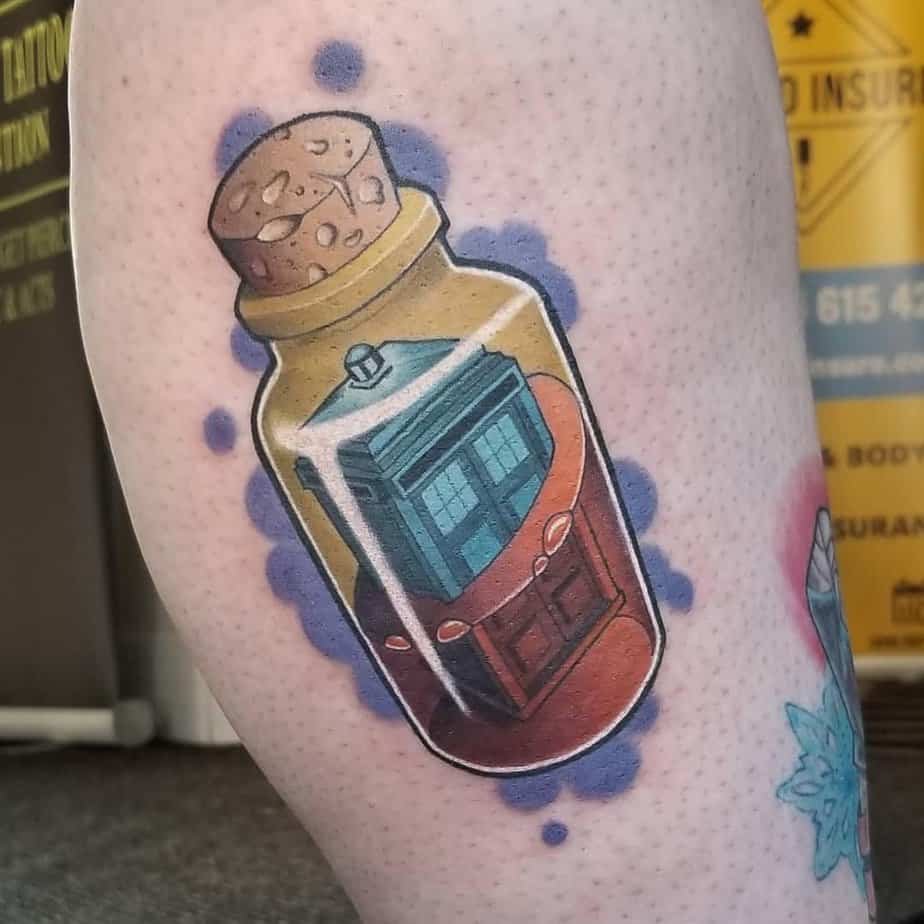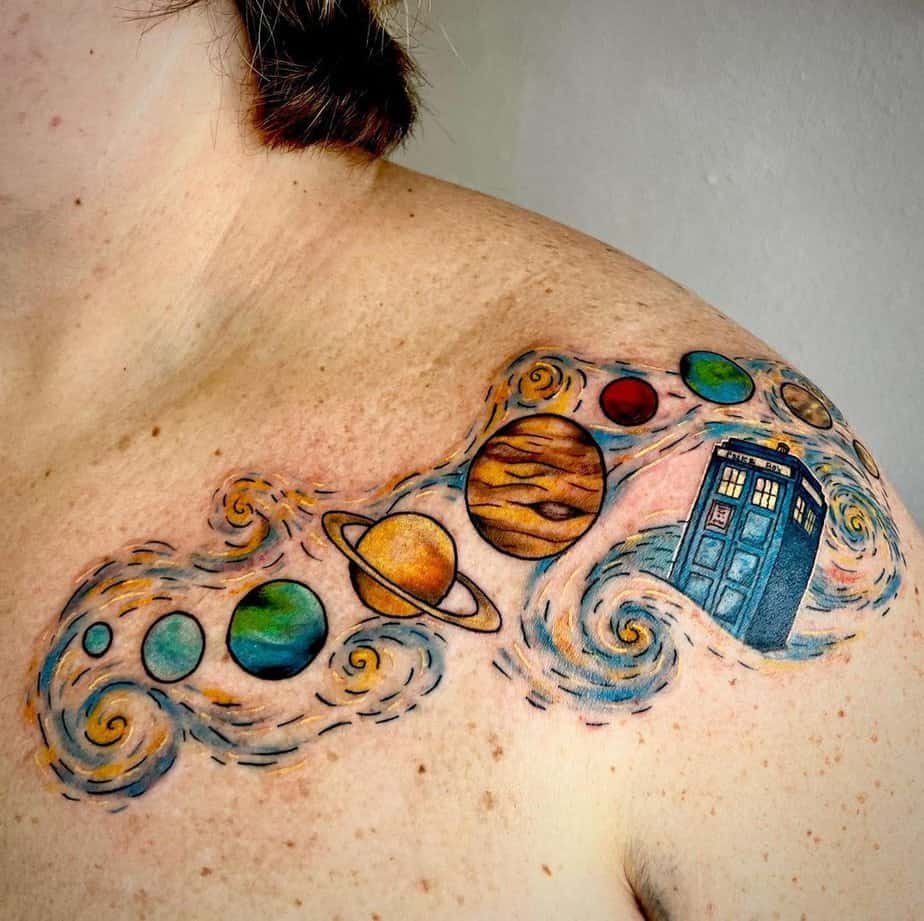 If that Doctor-meets-Van Gogh episode stuck with you, this is the tattoo. The Starry Night swirls—blues and yellows—wrap the TARDIS so it looks like it’s floating inside a painting. It’s tender, a little sad, and absolutely beautiful.