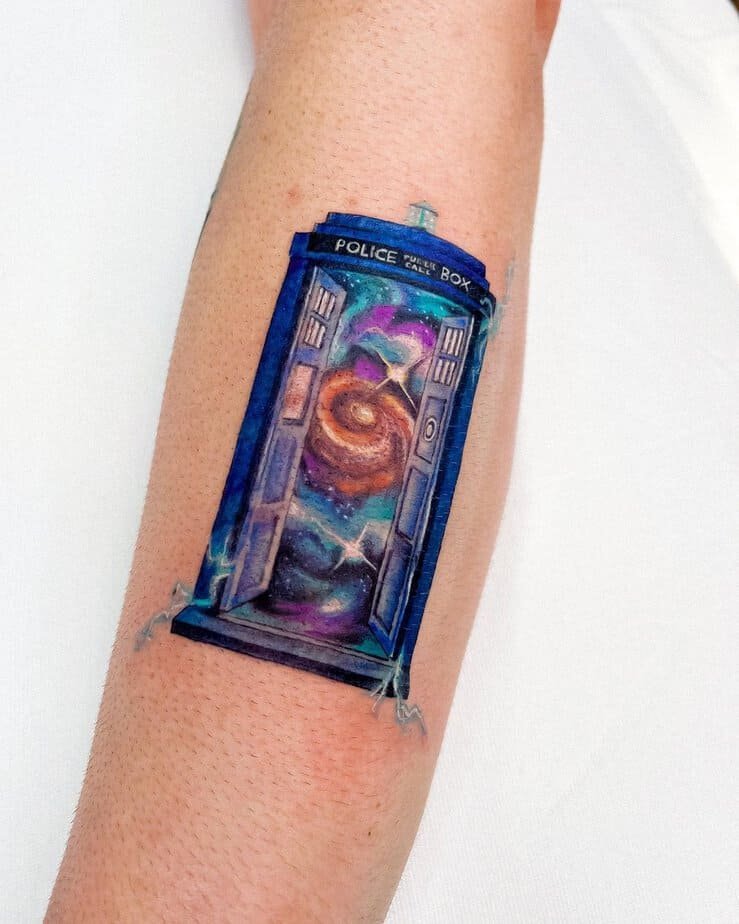 Here the TARDIS stands with its doors open to a swirling galaxy—purples, blues, oranges—inviting you to step through. It’s literally a portal tattoo, all cosmic wonder and possibility packed into one frame.
