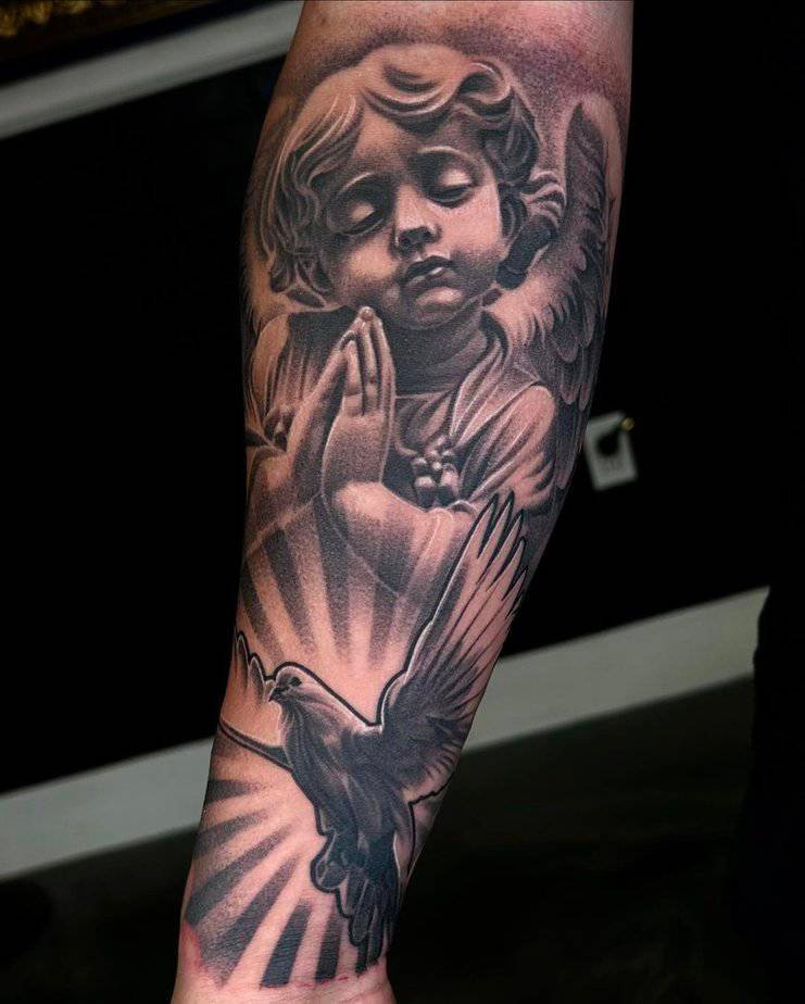 Imagine a small angel with hands clasped, eyes closed, a shy smile, and beneath them a dove in flight with light behind it. It reads like a reminder that someone — something — is watching over you. If you want a tattoo that whispers faith and protection without shouting, this combo does it so gently.
