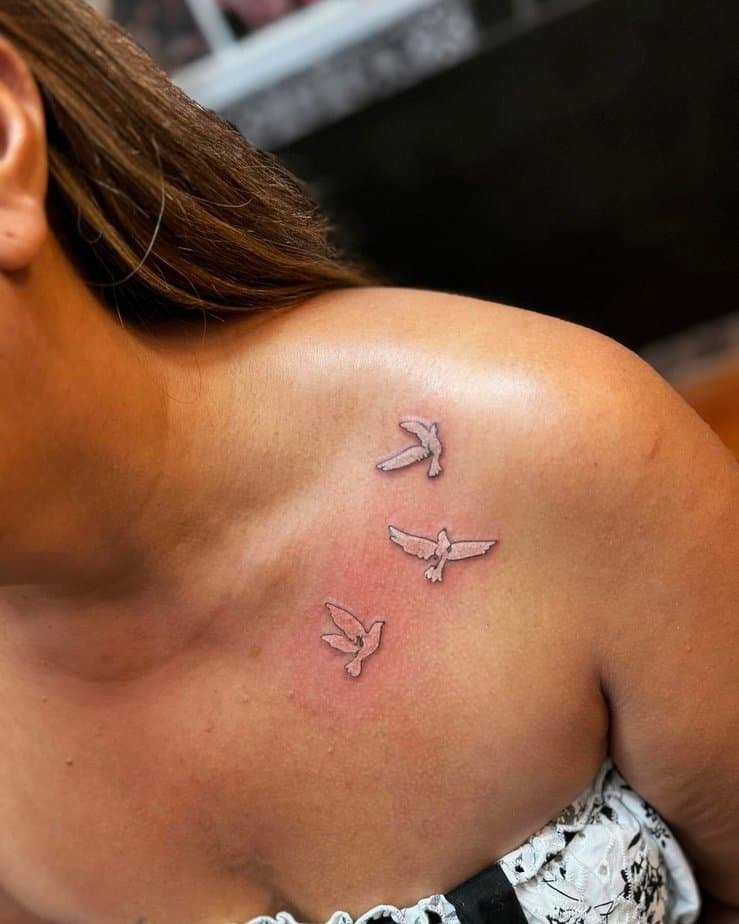 Three tiny flying doves along the collarbone