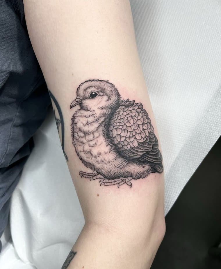 This black-ink folk dove carries a flower and has that classic, almost storybook feel. It’s simple but steady — a design that resists trends and reminds you of deeper life values. If you want a tattoo that feels evergreen, this one is a lovely pick.
