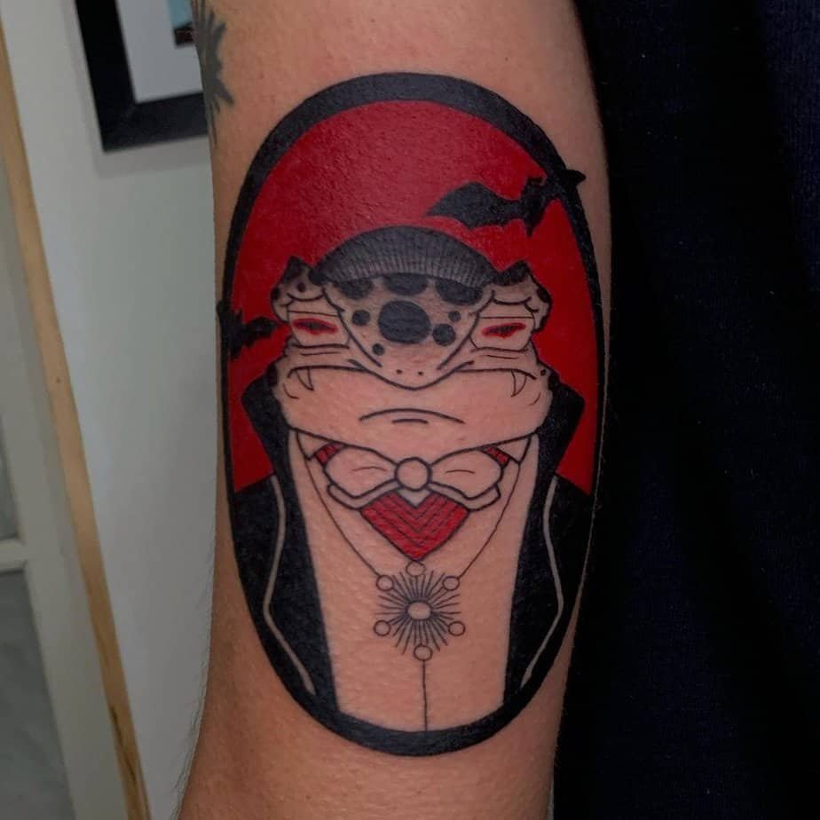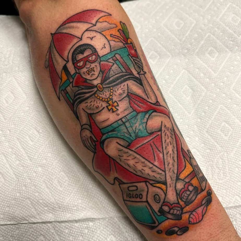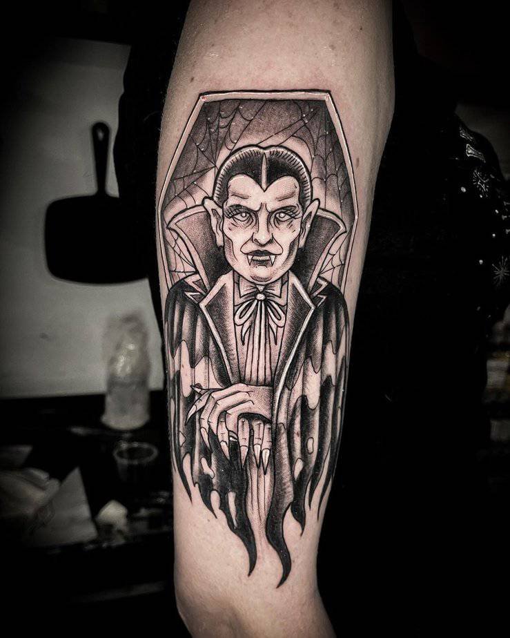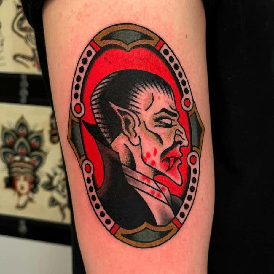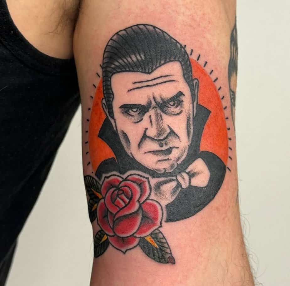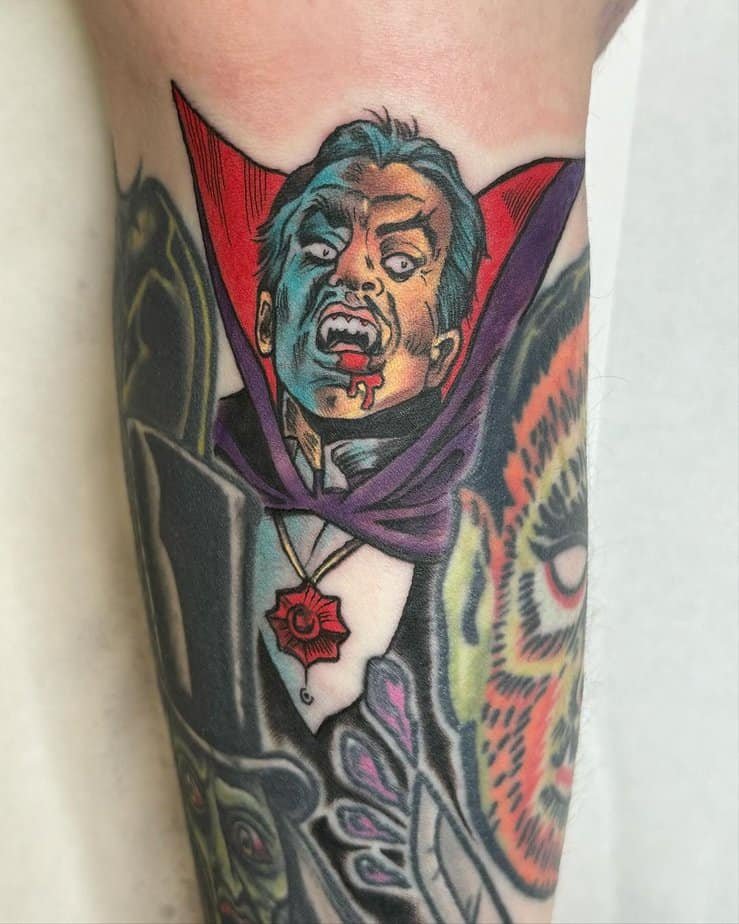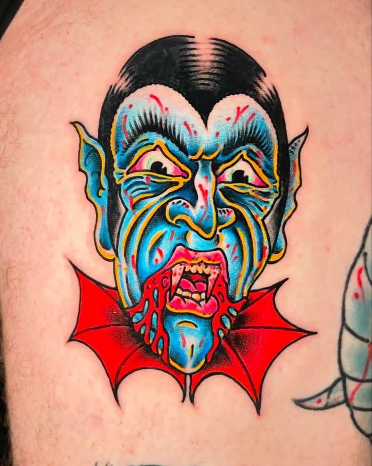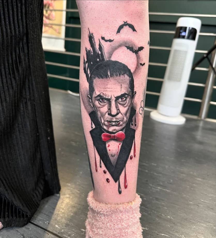 This blackwork piece leans hard into the vampire essentials: Dracula with blood at his mouth, the red popping against heavy black shading. There’s a red bow in there too, which somehow makes the whole thing both sinister and charismatically theatrical — like he’s about to invite you in and you know you shouldn’t go.