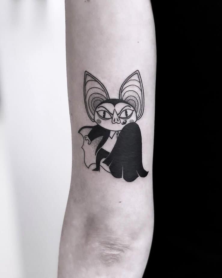Who said vampires can’t be cute? This tiny black-and-gray Dracula with bat ears gives off playful little-monster energy. It’s mysterious without being scary — perfect for a wrist, ankle, or behind-the-ear spot if you want something subtle and sweet.
