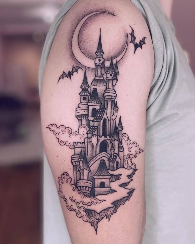 Okay, hear me out: you love Dracula’s aura but don’t want his face on your skin. This elegant black-and-gray castle scene is perfect — mist curling around the turrets, bats slicing through the night sky. It gives you that Gothic energy without being literal, and it looks stunning on an arm or sleeve when done in bold strokes.