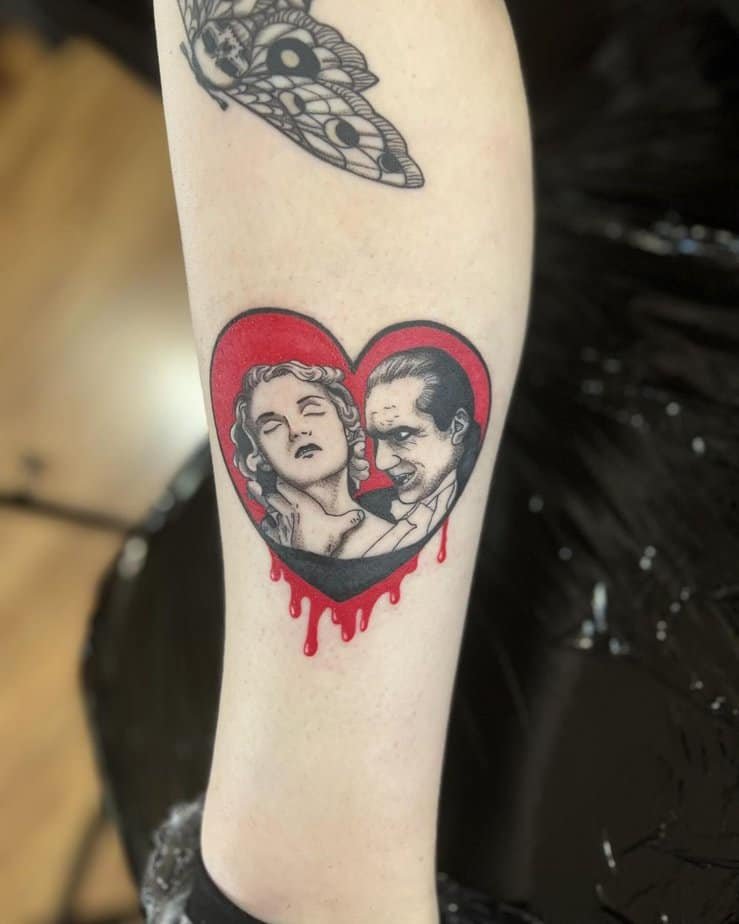 This tattoo explores the complicated pull between Dracula and Mina — love, possession, and the drip of danger. Done in minimalist black and gray with a heart in bold red (and blood dripping) it feels poetic and a little heartbreaking. If you like story-driven tattoos, this one’s for you.
