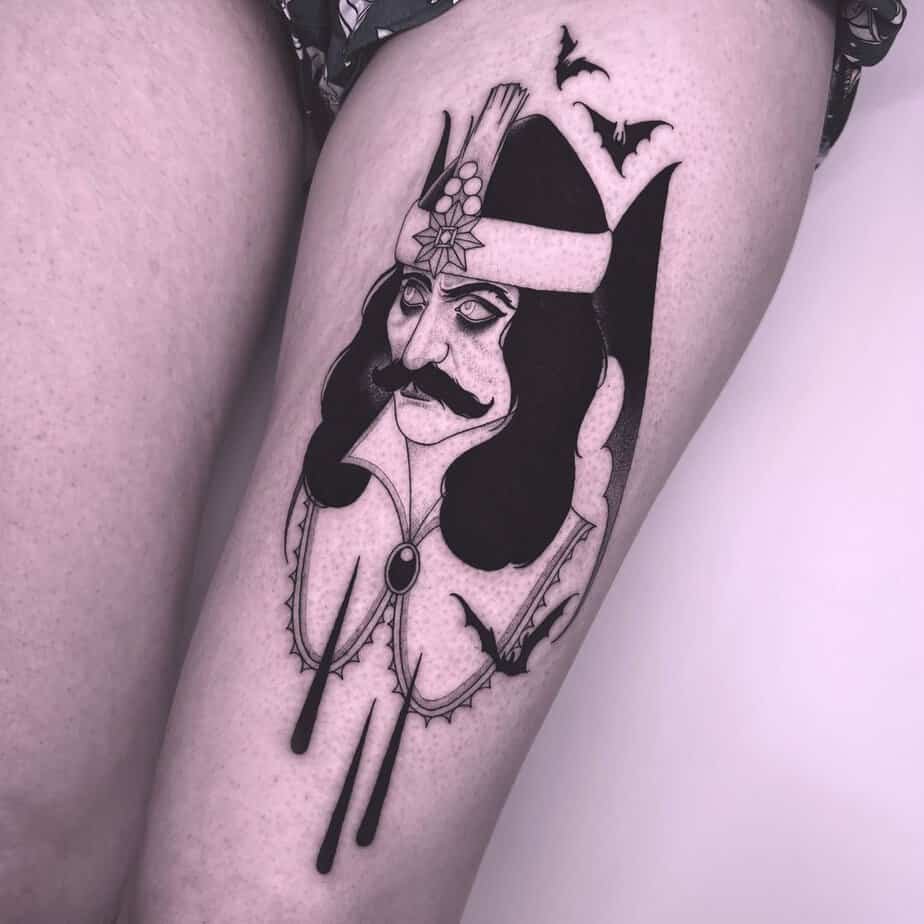 For the history nerds: a tattoo inspired by Vlad the Impaler, the real-life figure who partly inspired Dracula. The piece reads bold and symbolic, often done in heavy blackwork with tiny bats hovering above. It’s powerful and a little unsettling — in a good way.