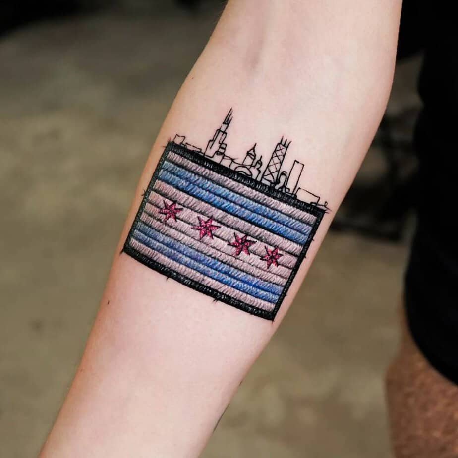 City flags can be so striking, and this Chicago flag tattoo captures that clean geometry — two light-blue stripes, the wider white stripe with four red six-pointed stars, and a skyline across the top. It’s civic love in thread-like ink.