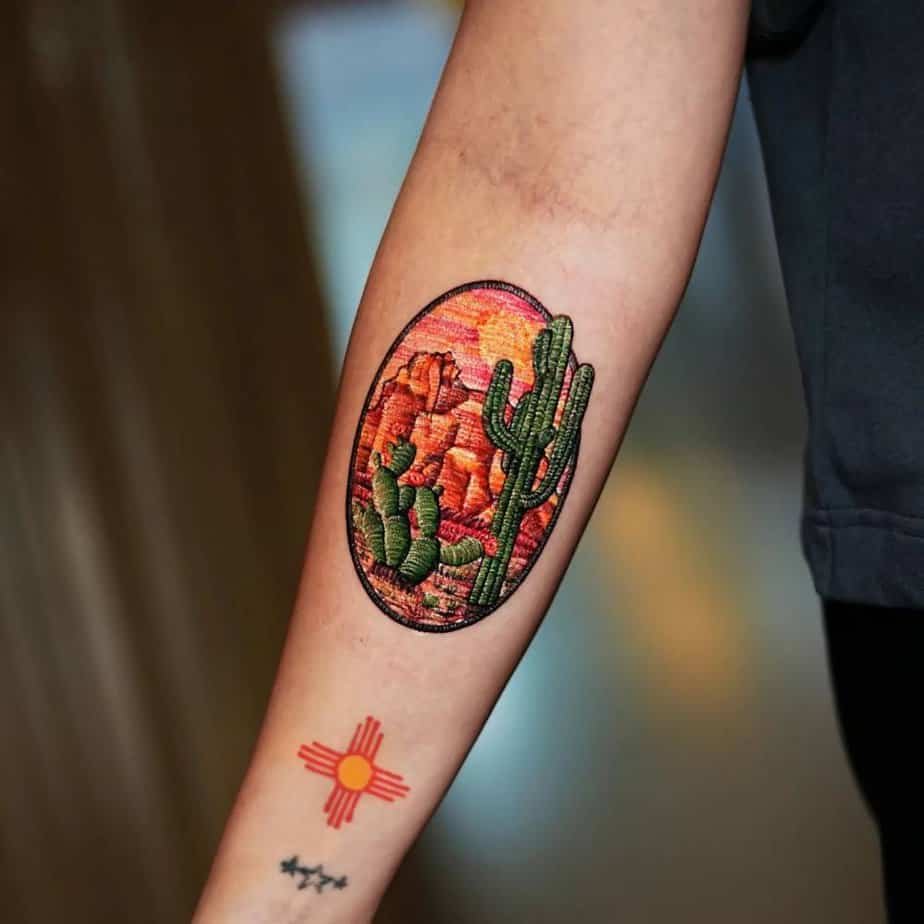 This forearm piece reads like a tiny postcard from a sun-warmed place: orange and brown dunes with green cacti poking in to give the scene life. The stitching-style lines make it feel handmade, like someone embroidered a memory onto skin. And you can’t ignore the symbolism — the cactus vibes of endurance and resilience, like a quiet reminder that you can thrive even when things are dry.
