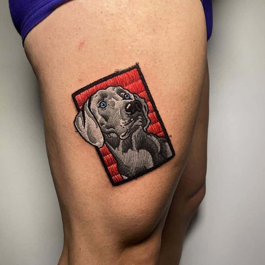 This thigh piece shows a silver-gray Weimaraner with a brick-red backdrop — strong, intelligent, and very person-focused. The embroidered detail brings out the breed’s sleekness while the background color lifts the whole thing. If dogs are your heart, this is a gorgeous tribute.