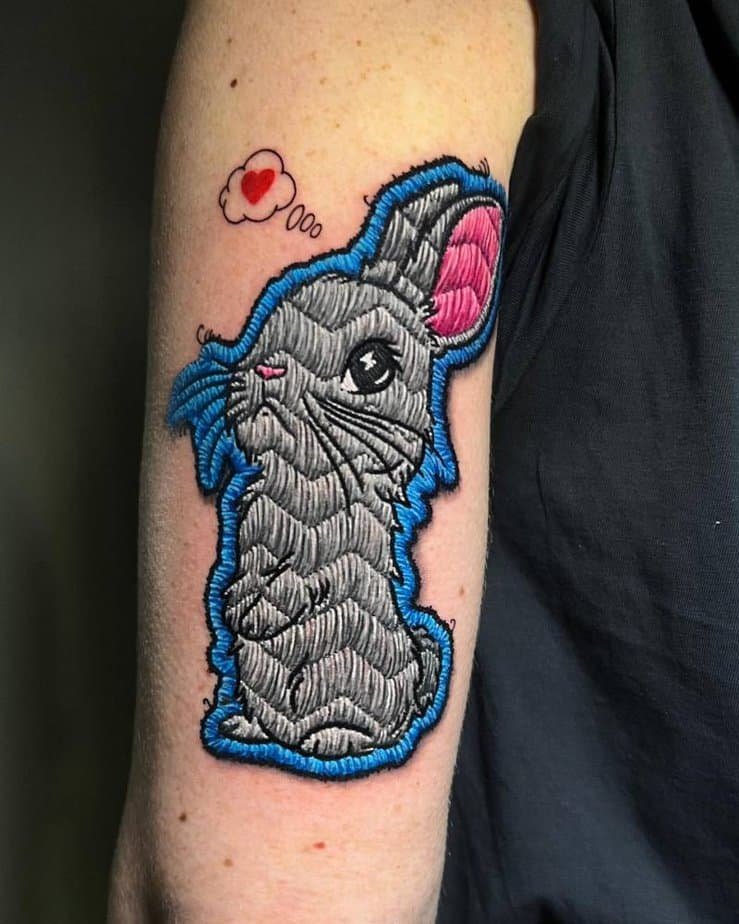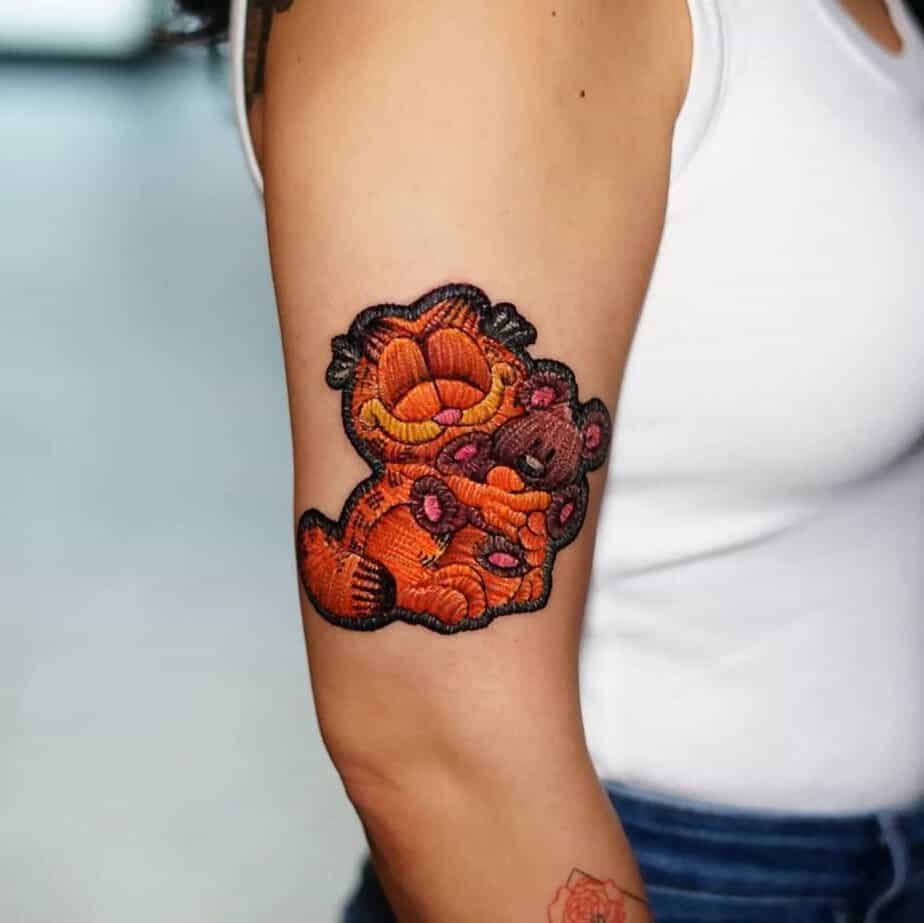 This upper-arm stitch of Garfield clutching his teddy is pure comfort. He’s that lazy, sarcastic spirit animal who loves lasagna and naps, and the embroidered style makes him look like he hopped off a cozy cross-stitch pillow. If you relate to a life of small pleasures and big naps, this one’s a mood.