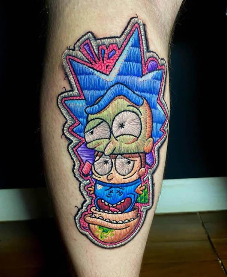 This leg piece shows the duo in all their interdimensional absurdity. Their philosophy — stop chasing some grand cosmic purpose and find what makes you happy — is darkly funny but oddly comforting. The embroidered style makes the idea feel softer and more playful.