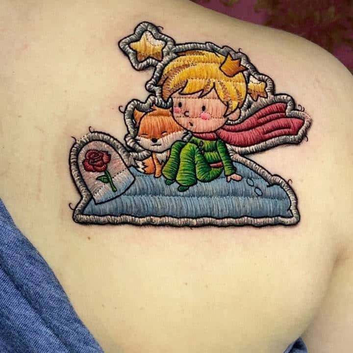 This shoulder blade tattoo captures the Little Prince on his asteroid with a fox and that iconic rose under glass. The red scarf and scattered yellow stars make it feel like a floating dream. It’s a reminder to keep wonder and friendship alive, and the embroidered look somehow makes that softness even more heartfelt.